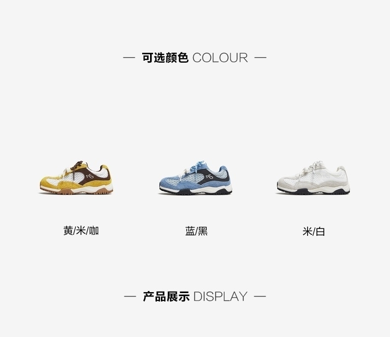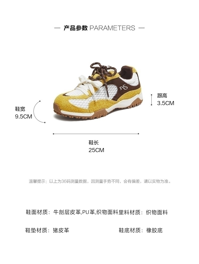 | 闭合方式:系带 | 风格:运动 | 跟高数值:3.5CM | 色系:黄色 | 配跟:无 |