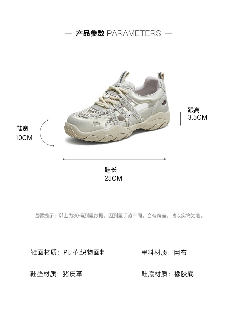 | 鞋跟形状:厚底 | 参考鞋长(女):25CM | 流行元素:纯色 | 参考鞋宽(女):10CM | 风格:运动 |