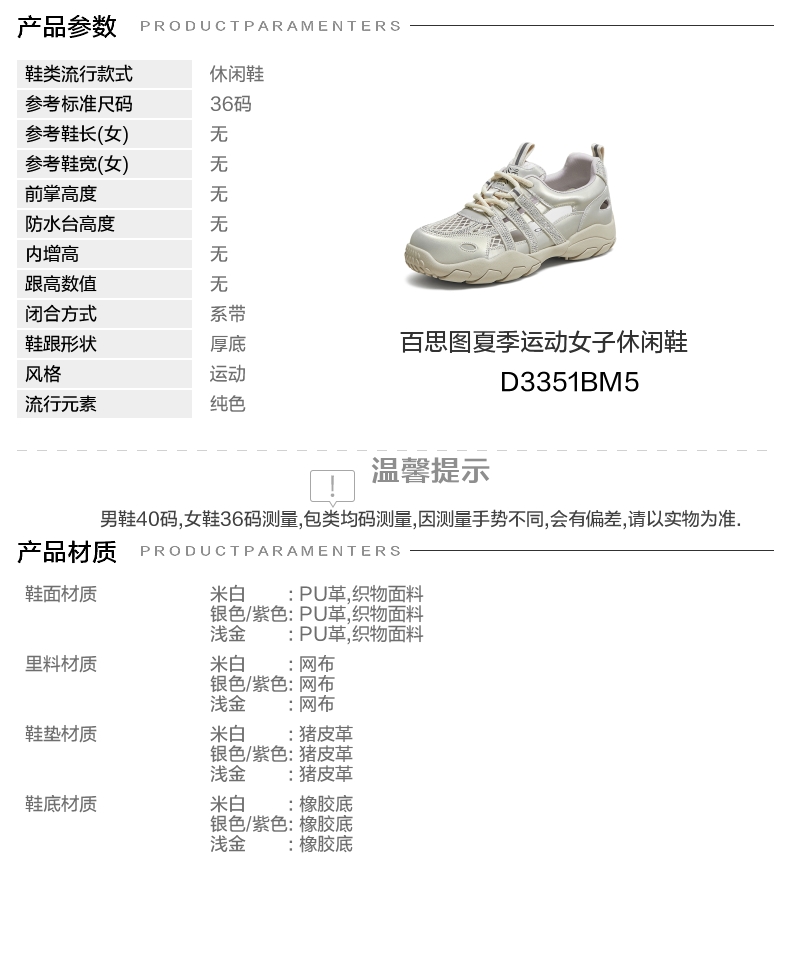 | 色系:金色 | 跟高数值:3.5CM | 性别:女子 | 里料材质:网布 | 制鞋工艺:胶贴皮鞋 |