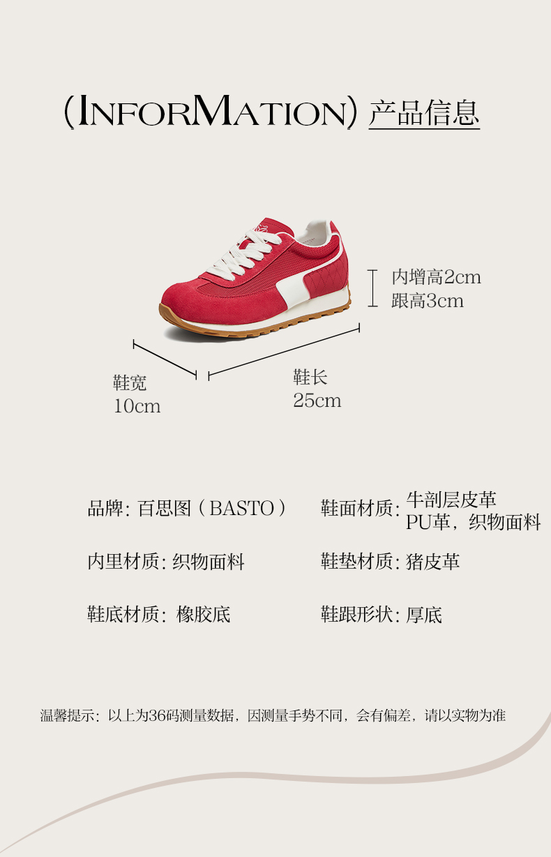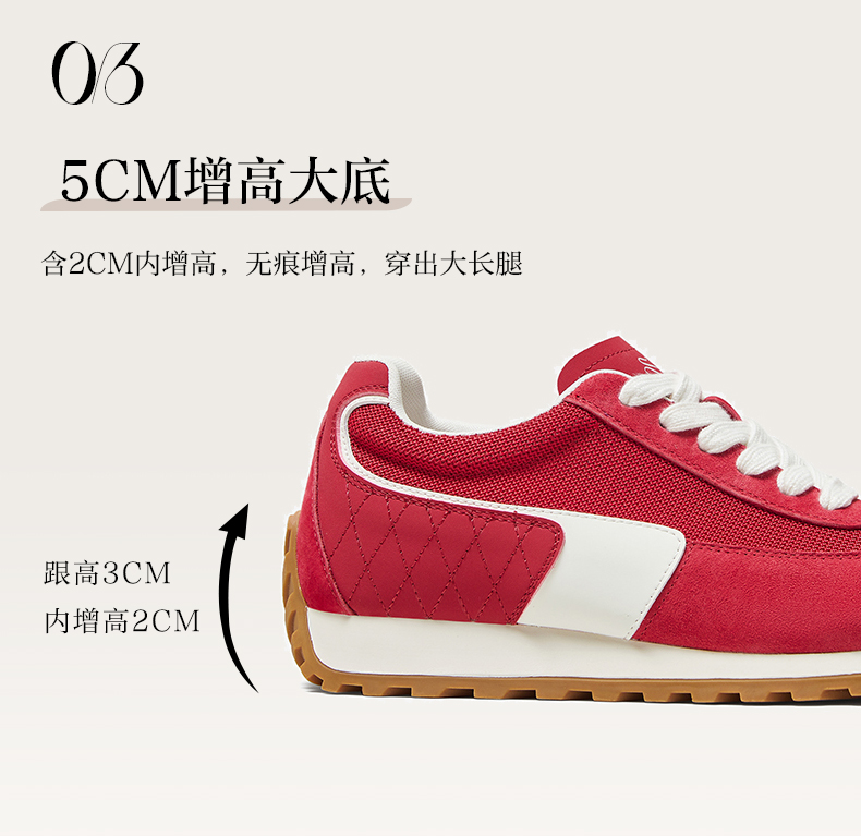 | 鞋帮:低帮 | 鞋底材质:橡胶底 | 内增高:2CM | 鞋面材质:织物面料PU革猪剖层皮革 | 闭合方式:系带 |