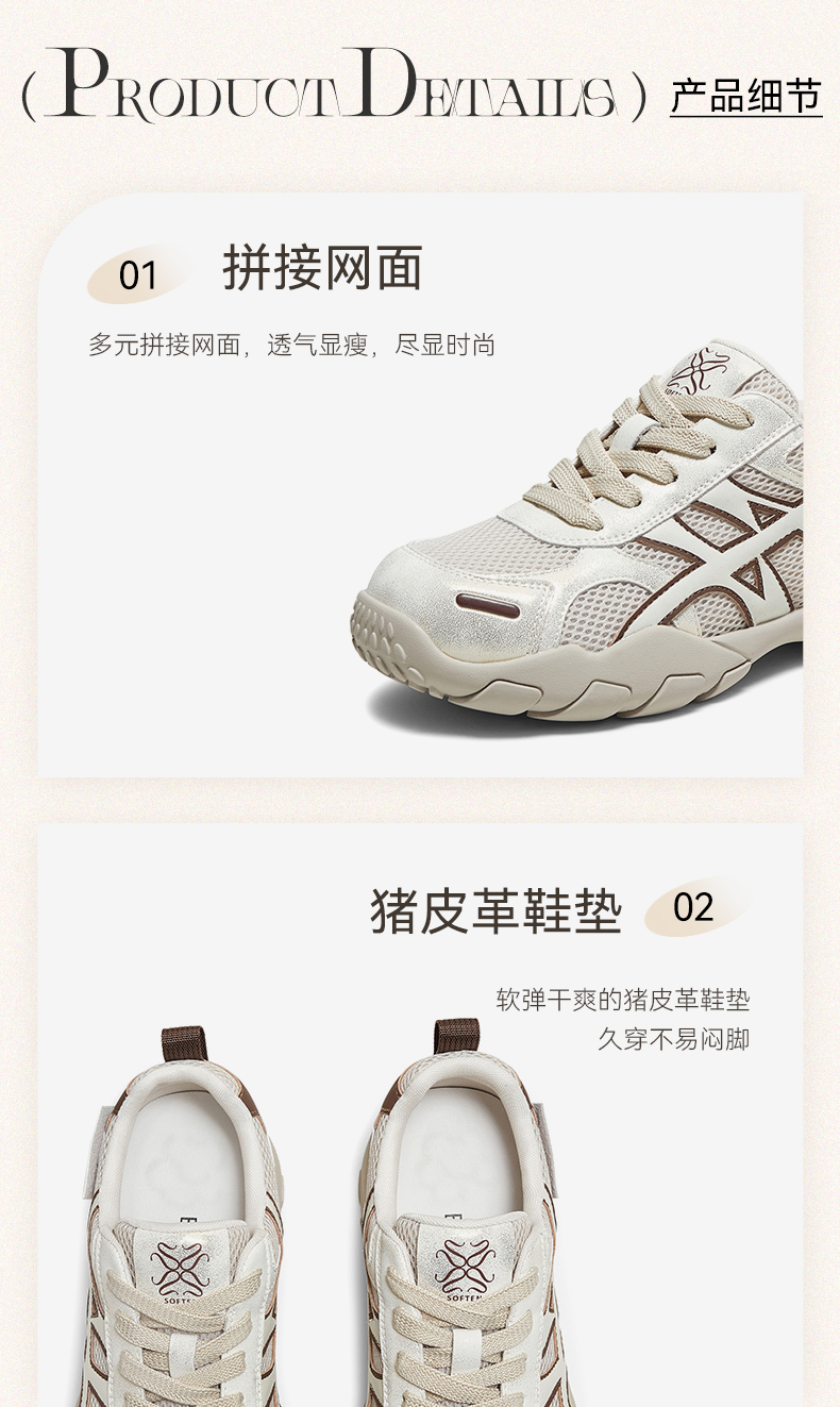 | 色系:米白 | 跟高数值:4.5CM | 性别:女子 | 里料材质:网布 | 制鞋工艺:胶贴皮鞋 |