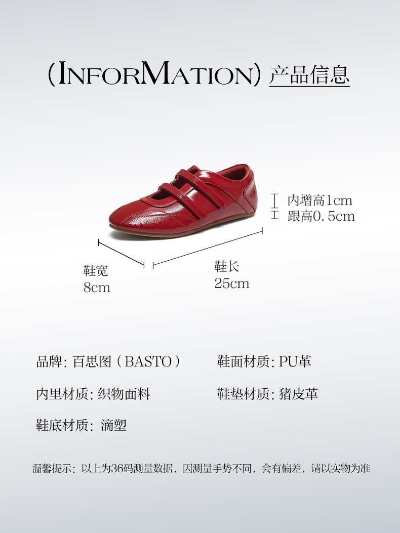 | 跟高数值:0.5CM | 适用人群:女子 | 性别:女子 | 里料材质:织物面料 | 制鞋工艺:胶贴皮鞋 |