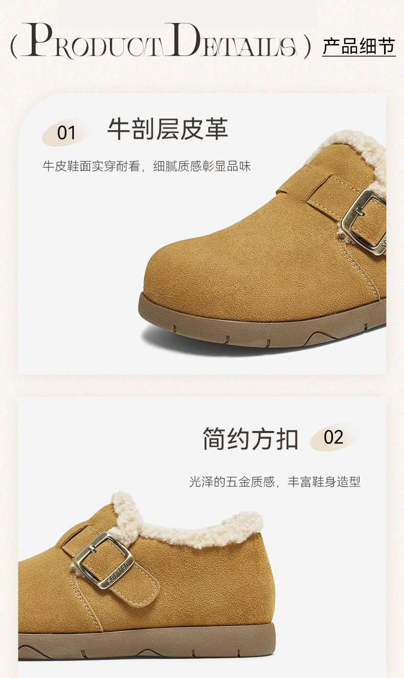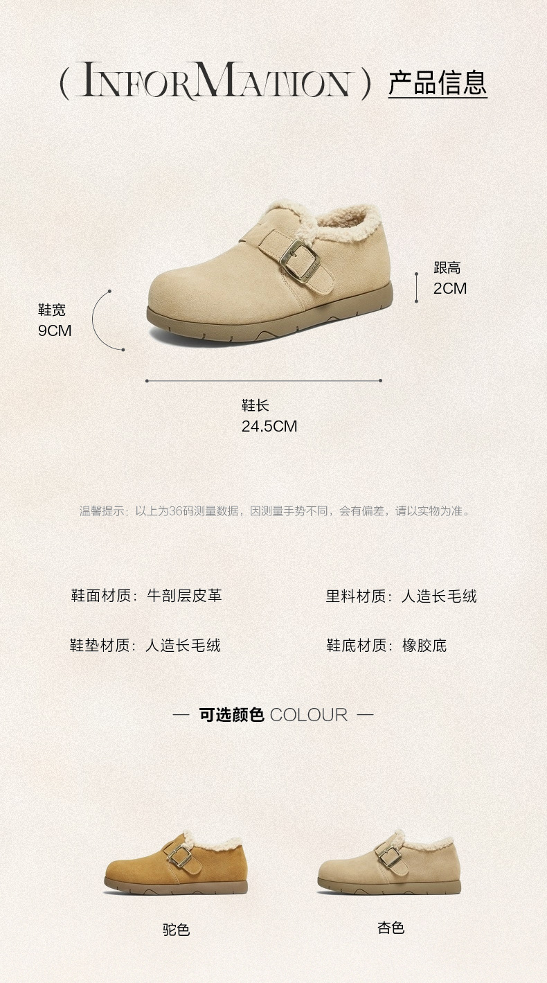 | 色系:杏色 | 跟高数值:2CM | 性别:女子 | 里料材质:人造长毛绒 | 制鞋工艺:胶贴皮鞋 |