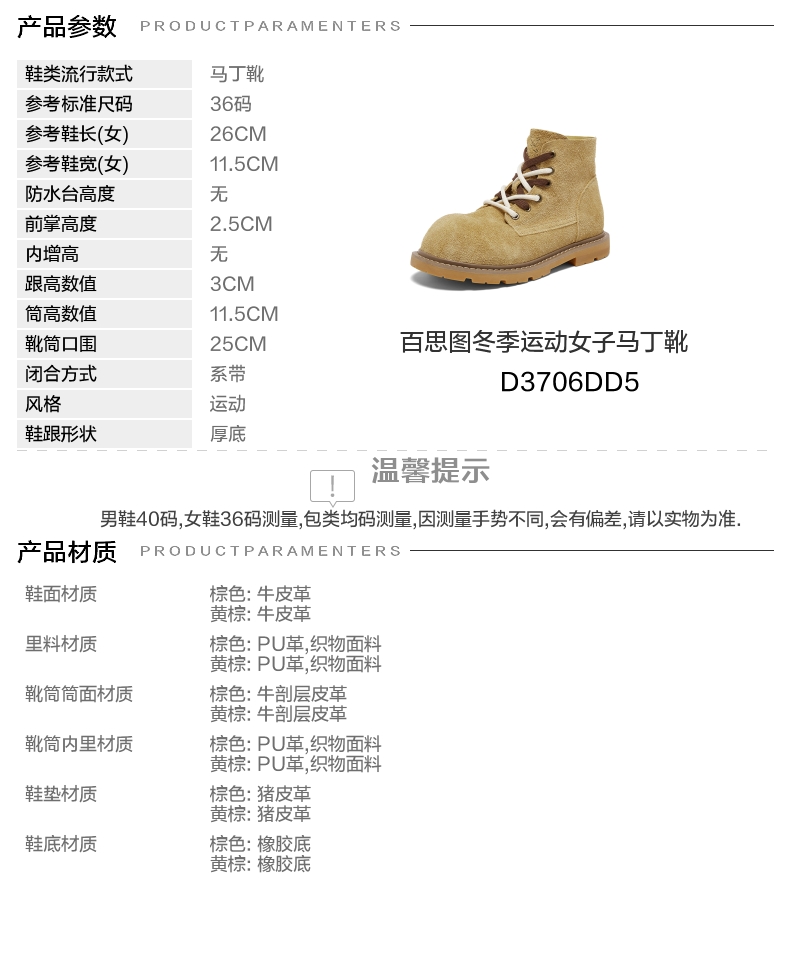 | 参考鞋宽(女):11.5CM | 风格:运动 | 色系:棕色 | 跟高数值:3CM | 筒高数值:11.5CM |