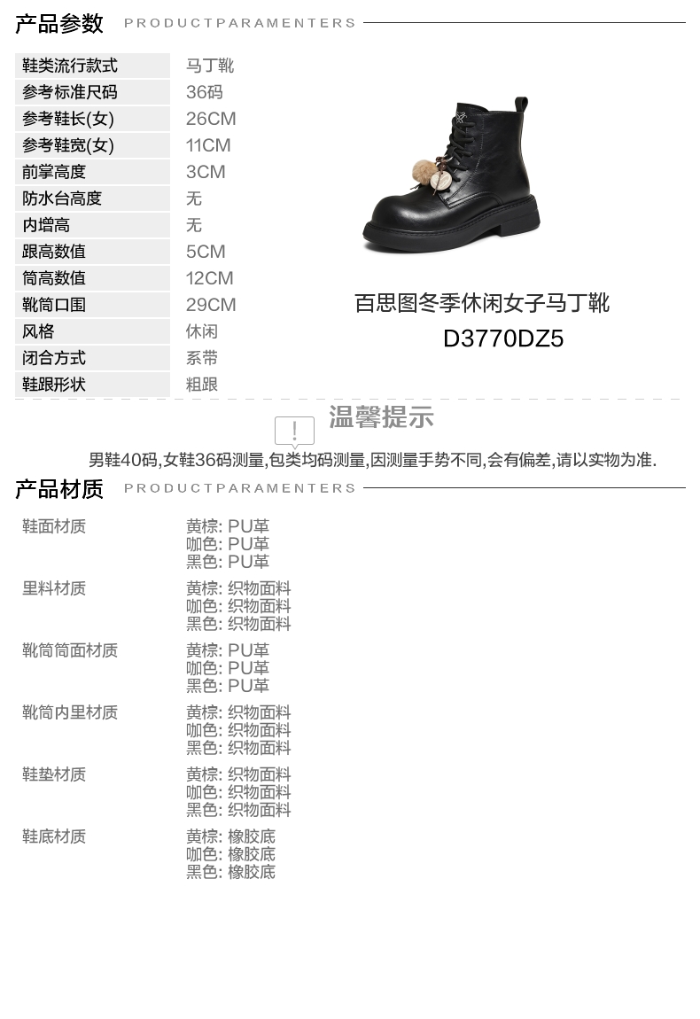 | 靴筒筒面材质:PU革 | 里料材质:织物面料 | 制鞋工艺:胶贴皮鞋 | 鞋垫材质:织物面料 | 款式季节:冬季 |