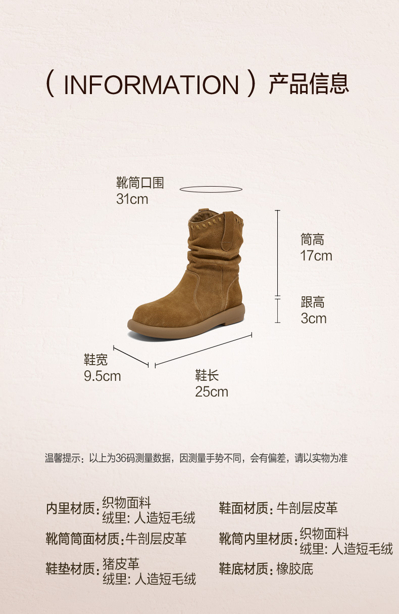 | 配跟:无 | 靴筒口围:31CM | 上市时间:2025年冬季 | 鞋类流行款式:西部靴 | 鞋头款式:圆头 |