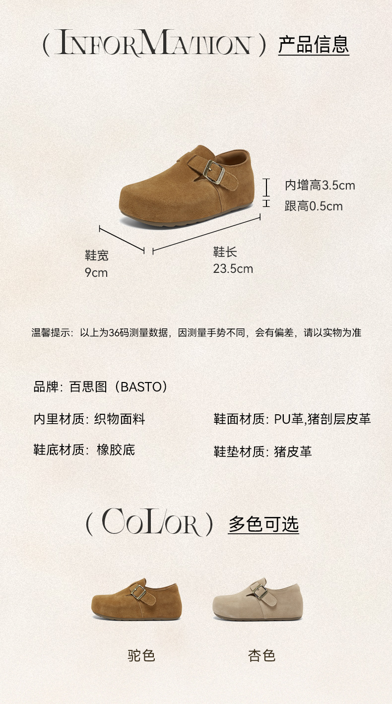 | 鞋帮:低帮 | 鞋底材质:橡胶底 | 内增高:3.5CM | 鞋面材质:牛剖层皮革 | 闭合方式:搭扣套脚 |