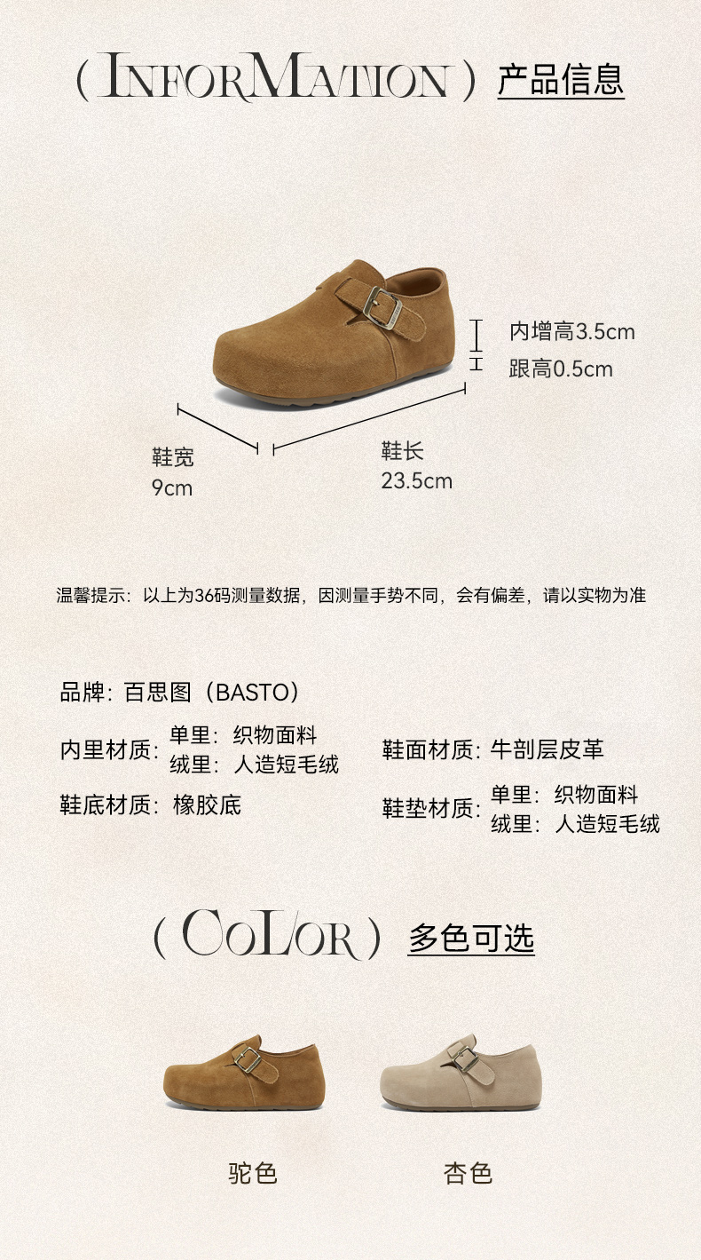 | 鞋帮:低帮 | 鞋底材质:橡胶底 | 内增高:3.5CM | 鞋面材质:牛剖层皮革 | 闭合方式:套脚搭扣 |