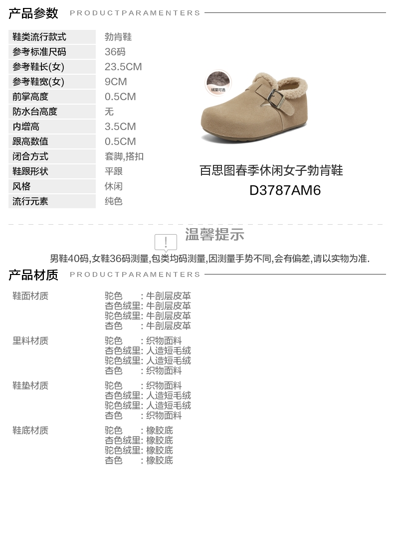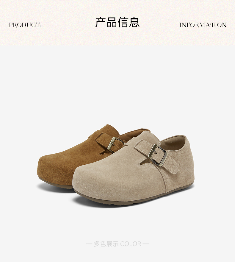 | 配跟:无 | 上市时间:2026年春季 | 鞋类流行款式:勃肯鞋 | 鞋头款式:圆头 | 鞋面图案:纯色 |