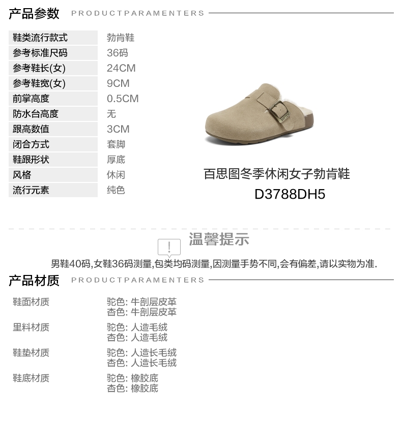 | 鞋垫材质:人造长毛绒 | 款式季节:冬季 | 皮质特征:二层皮 | 前掌高度:0.5CM | 防水台高度:无 |