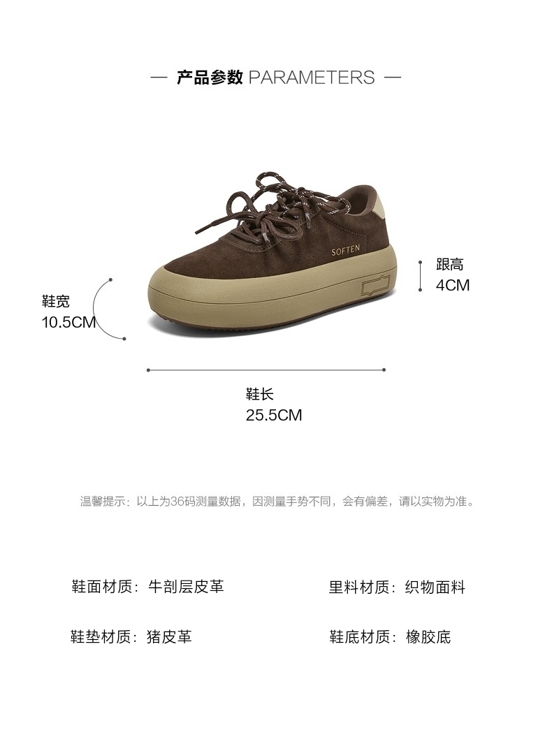 | 鞋帮:低帮 | 鞋底材质:橡胶底 | 内增高:无 | 鞋面材质:牛剖层皮革 | 闭合方式:系带 |