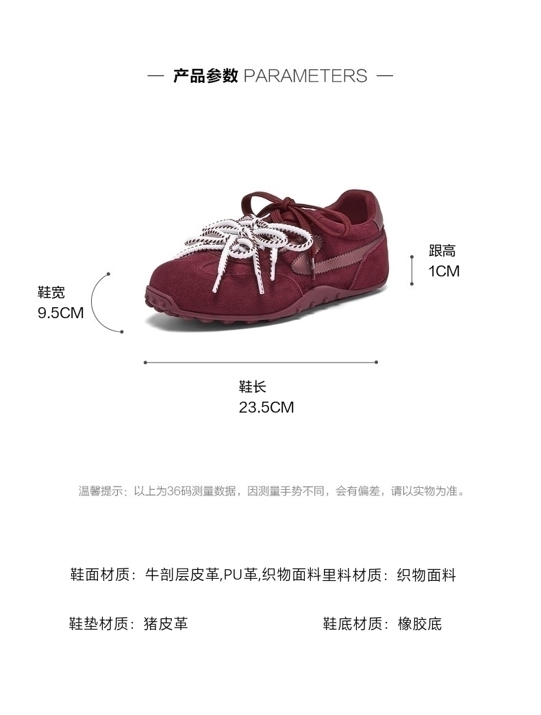 | 鞋帮:低帮 | 鞋底材质:橡胶底 | 内增高:2.5CM | 鞋面材质:织物面料PU革牛剖层皮革 | 闭合方式:系带 |