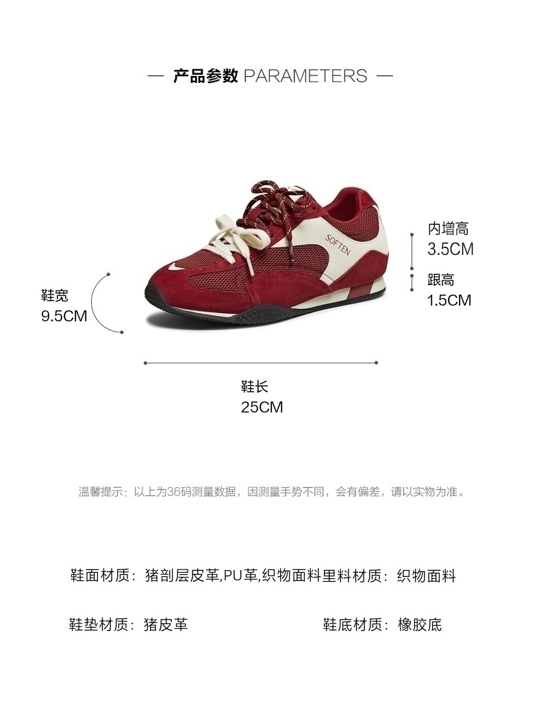 | 鞋帮:低帮 | 鞋底材质:橡胶底 | 内增高:3.5CM | 鞋面材质:织物面料PU革猪剖层皮革 | 闭合方式:系带 |