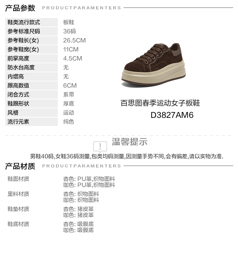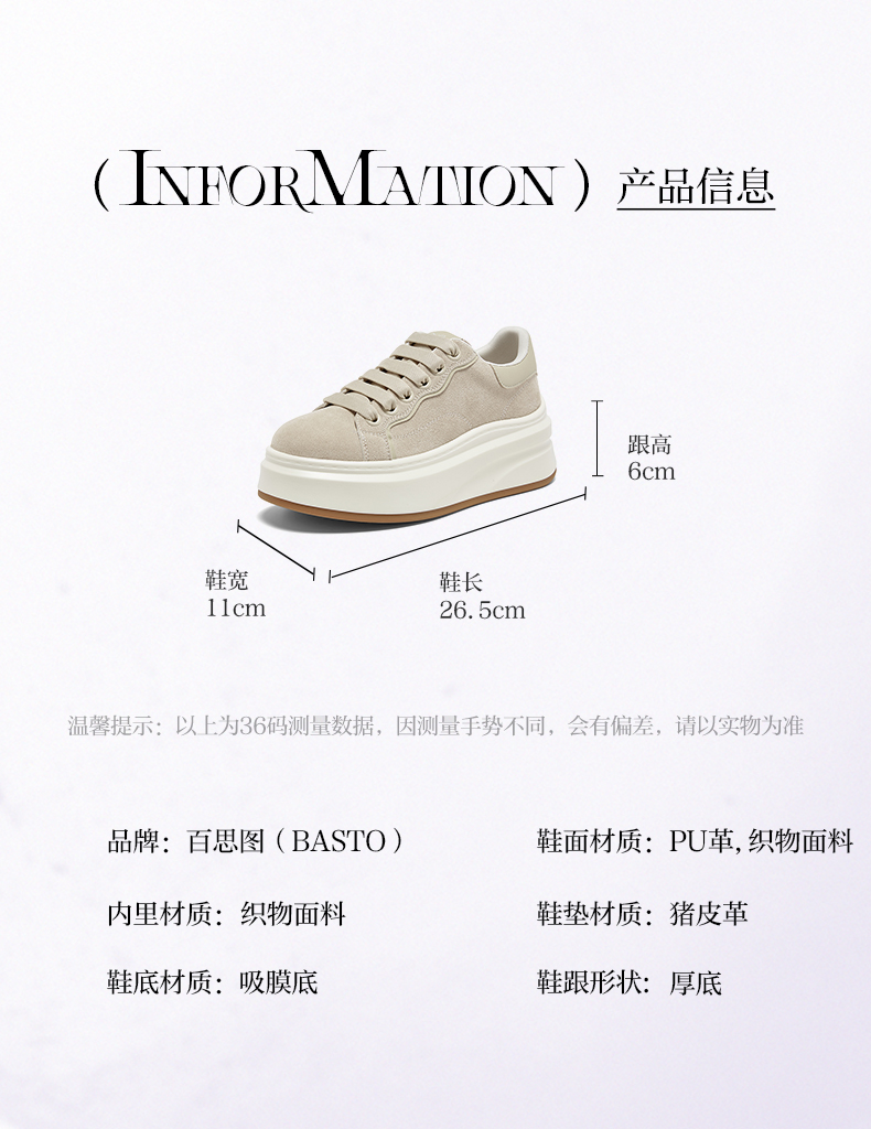 | 鞋跟形状:厚底 | 参考鞋长(女):26.5CM | 流行元素:纯色 | 参考鞋宽(女):11CM | 风格:运动 |