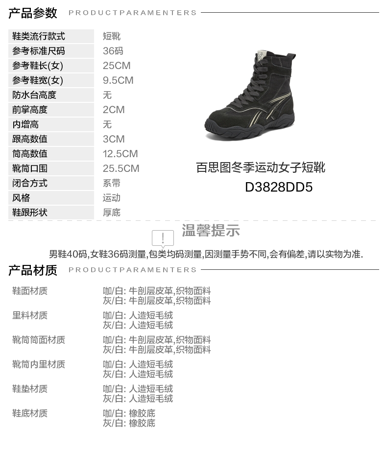 | 帮面材质:织物牛剖层革 | 配跟:无 | 靴筒口围:25.5CM | 上市时间:2025年冬季 | 鞋类流行款式:短靴 |
