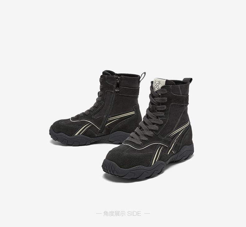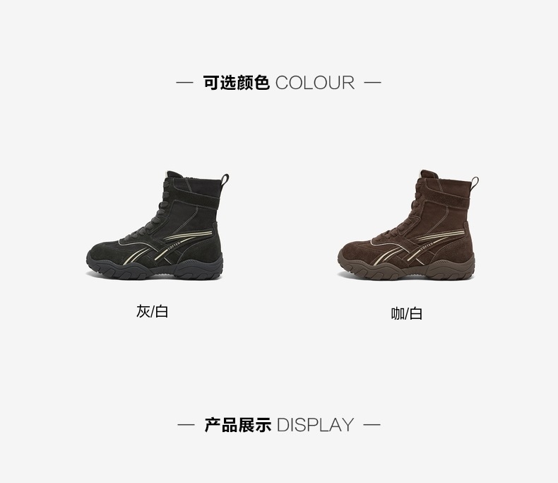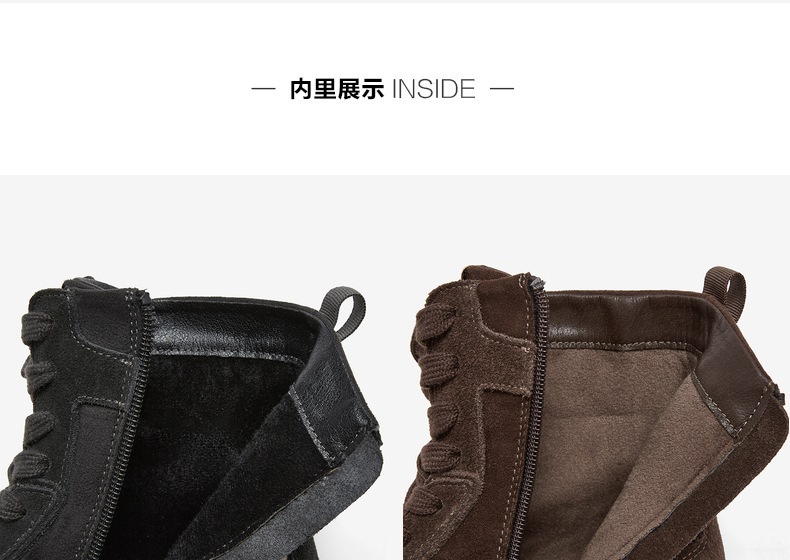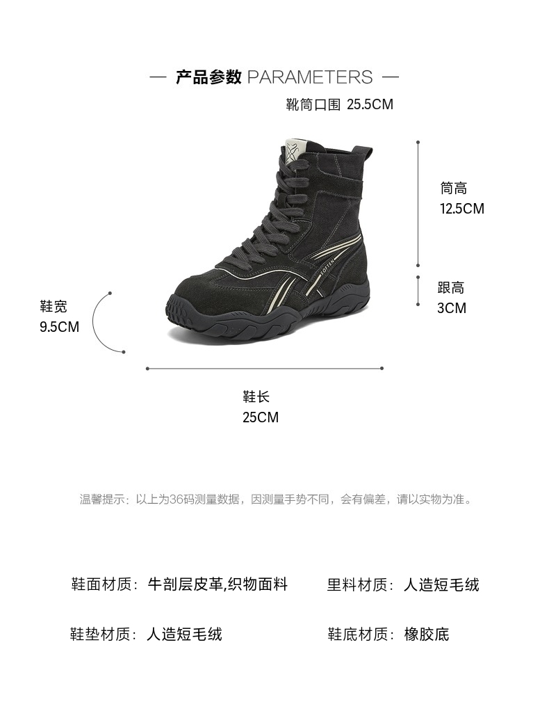 | 鞋底材质:橡胶底 | 靴筒内里材质:人造短毛绒 | 内增高:无 | 鞋面材质:织物面料牛剖层皮革 | 闭合方式:系带 |