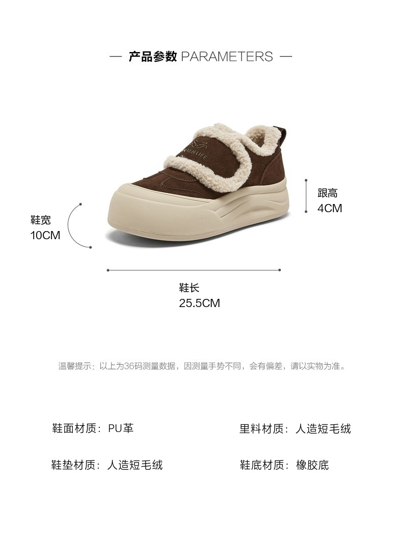 | 里料材质:人造短毛绒 | 制鞋工艺:胶贴皮鞋 | 鞋垫材质:人造短毛绒 | 款式季节:春季 | 前掌高度:4CM |