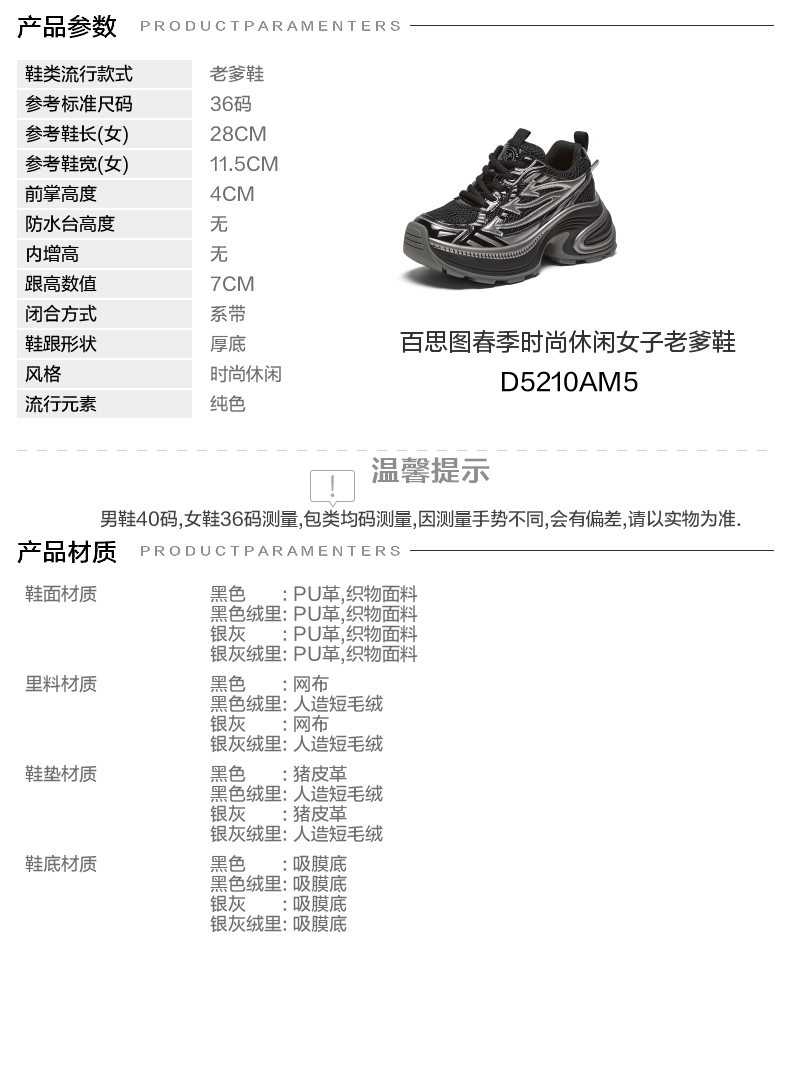 | 风格分类:老爹鞋 | 上市时间:2025年春季 | 生产/经销/进口厂家:丽荣鞋业(深圳)有限公司 | 鞋类流行款式:老爹鞋 | 鞋头款式:圆头 |