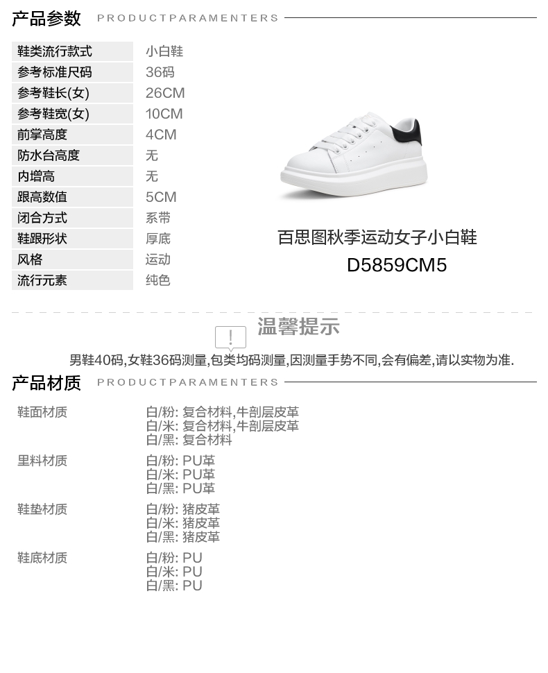 | 色系:白色 | 跟高数值:5CM | 性别:女子 | 里料材质:PU革 | 制鞋工艺:胶贴皮鞋 |