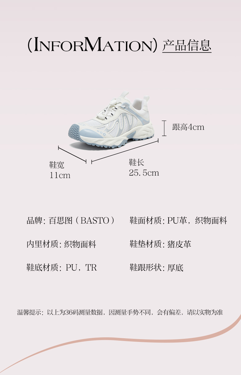 BASTO(百思图),品牌拥有17年历史,秉承优雅、甜美、清新的设计理念,主张“好嫁风”的产品风格,将甜美俏丽的少女情怀融合优雅气质的时尚品味,塑造出唯美优雅、受欢迎的女鞋款式。主打以女性温柔与亲和力为特色的流行时尚产品,糅合雅致又富有亲和力的裸粉色调,淑媛端庄、清新甜美。目前品牌已开设线下门店达1400多家。