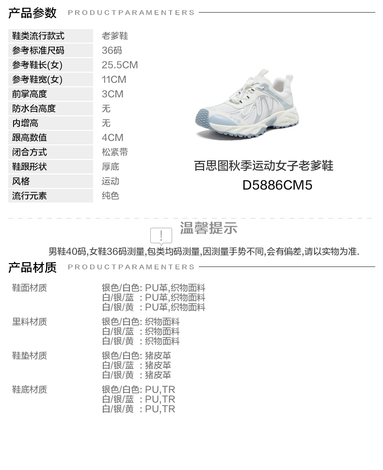 | 鞋跟形状:厚底 | 参考鞋长(女):25.5CM | 流行元素:纯色 | 参考鞋宽(女):11CM | 风格:运动 |