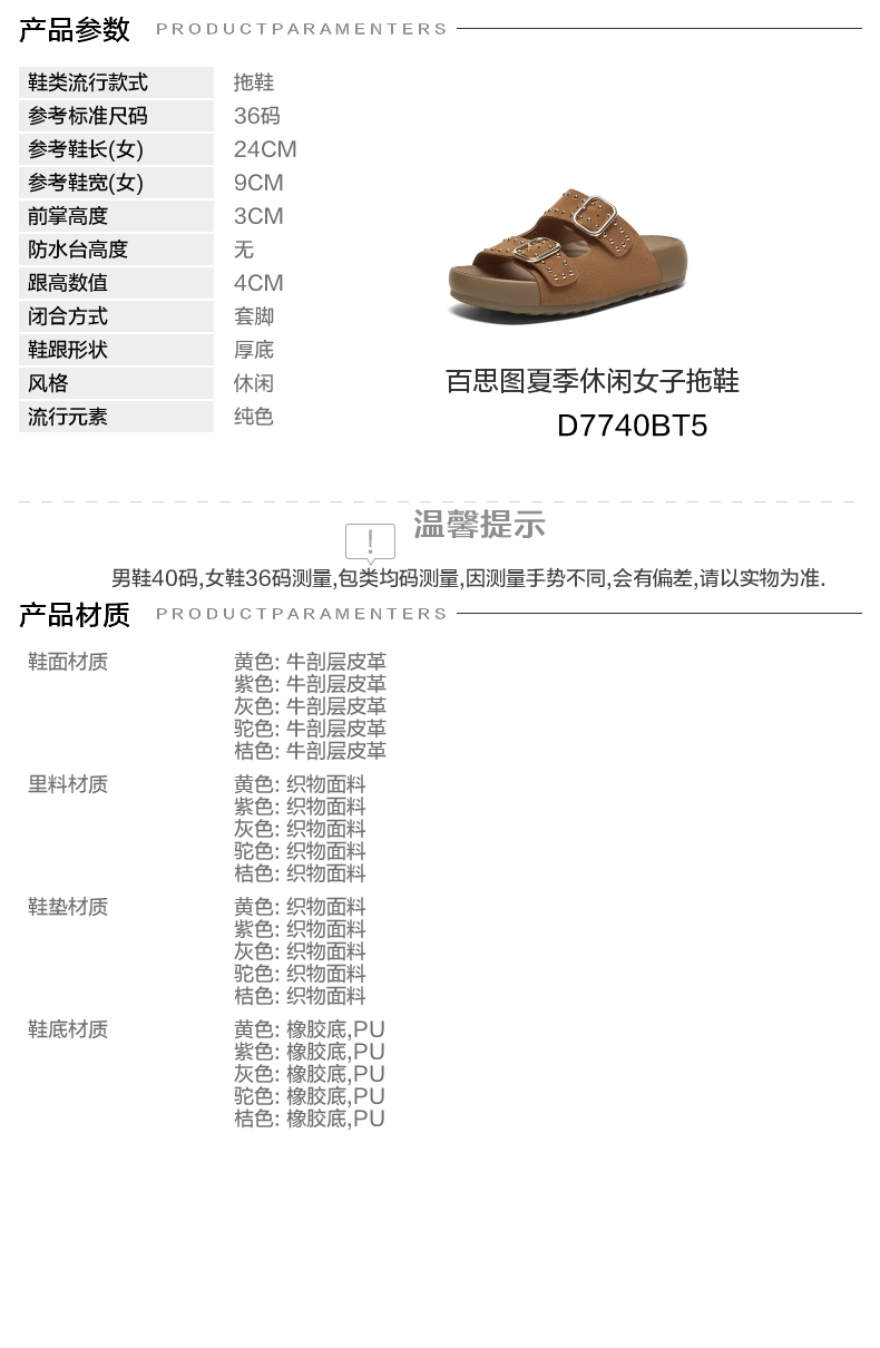 | 鞋类流行款式:拖鞋 | 鞋头款式:露趾 | 执行标准:拖鞋 QB/T 4552-2020 | 跟高范围:中跟鞋(3-5CM) | 鞋面图案:纯色 |