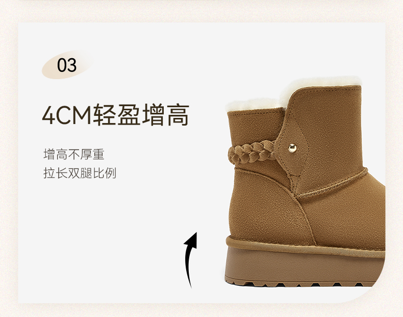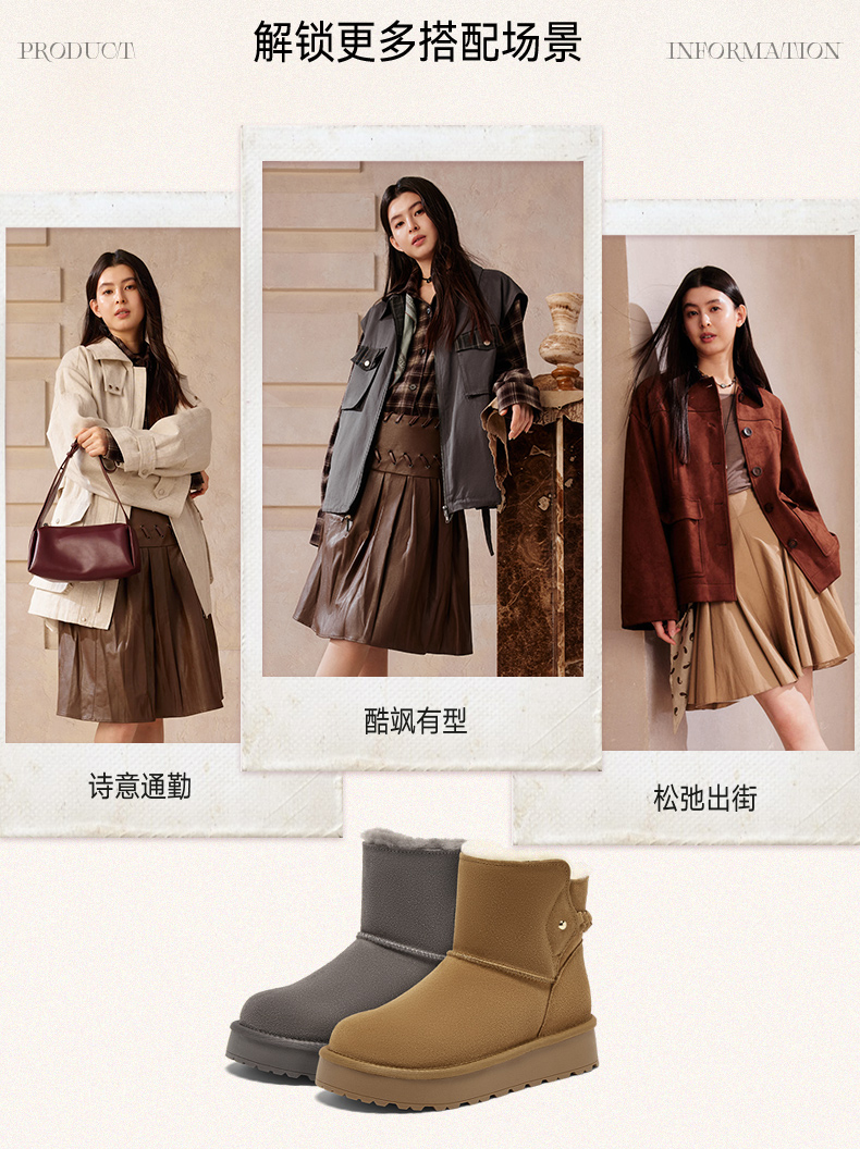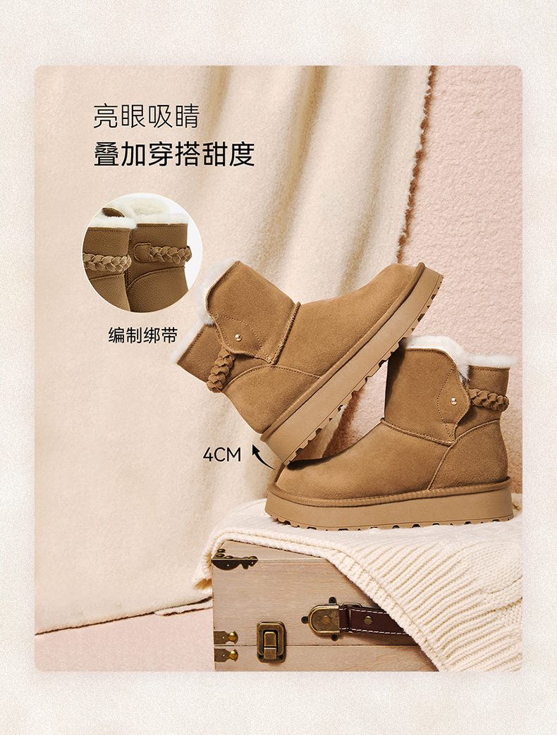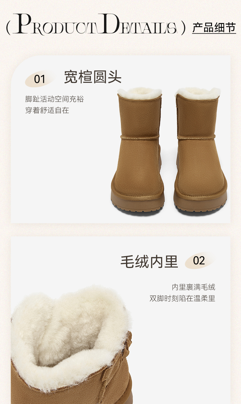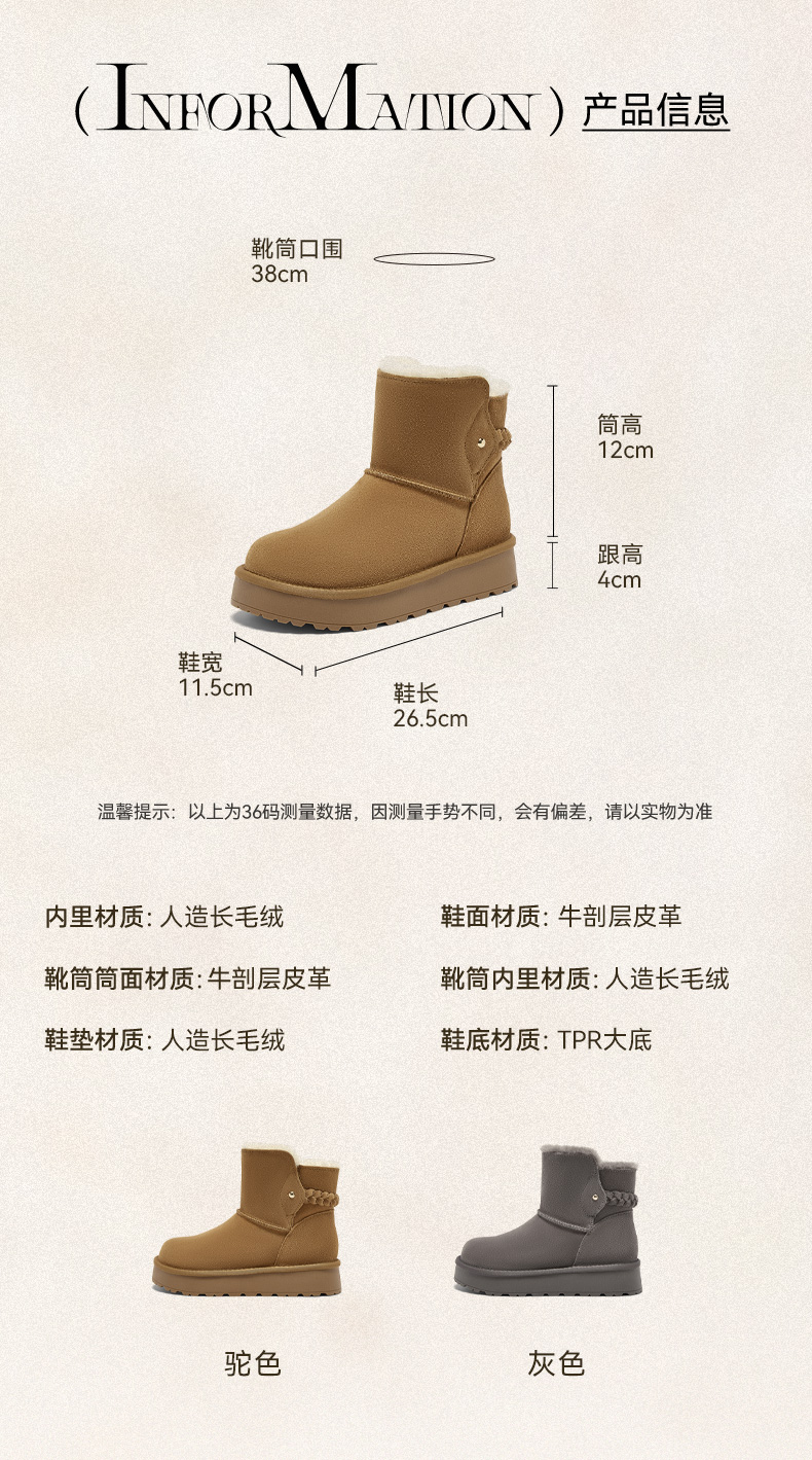 | 帮面材质:牛剖层革 | 配跟:无 | 靴筒口围:38CM | 上市时间:2025年冬季 | 鞋类流行款式:雪地靴 |
