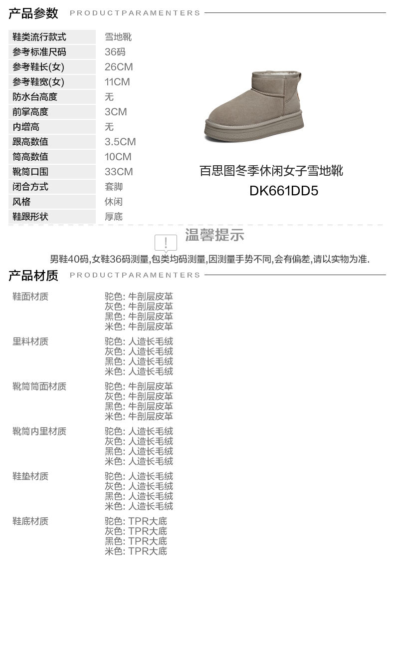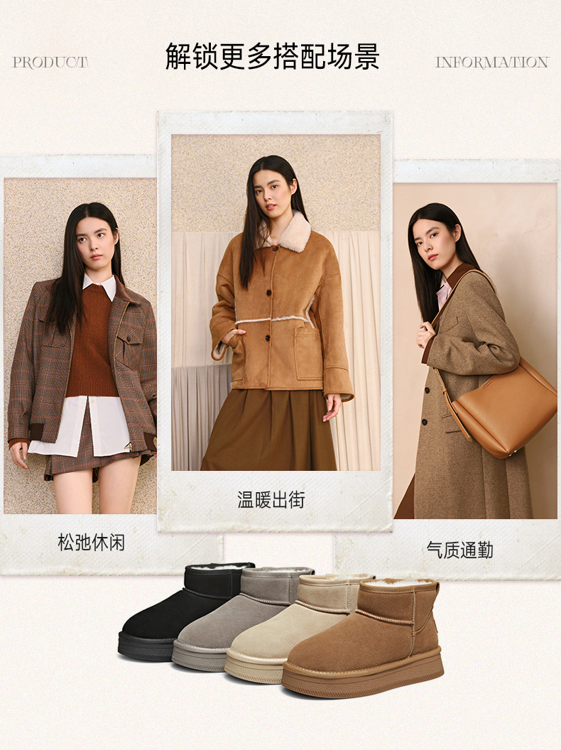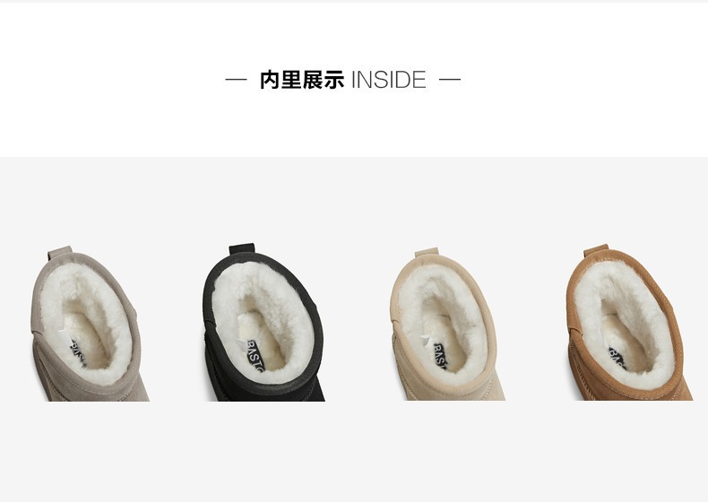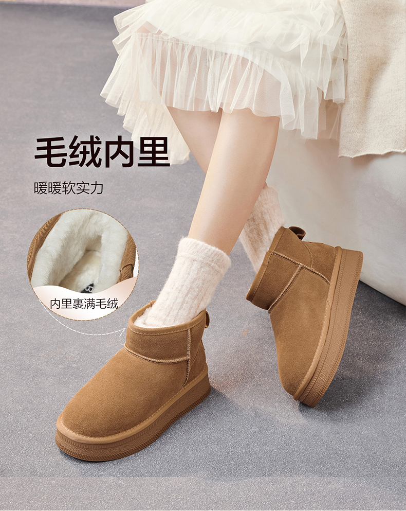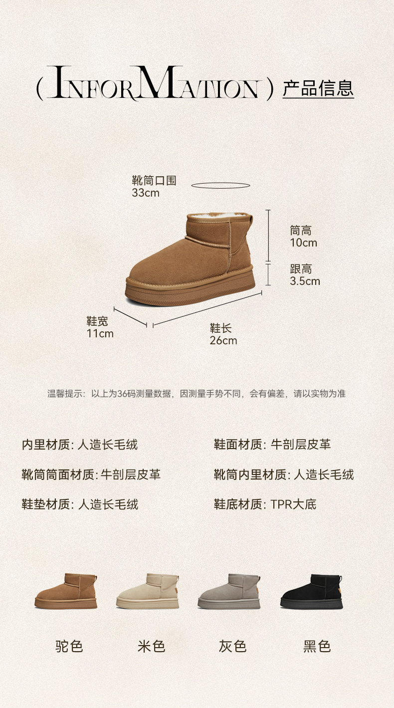 | 帮面材质:牛剖层革 | 配跟:无 | 靴筒口围:33CM | 上市时间:2025年冬季 | 鞋类流行款式:雪地靴 |