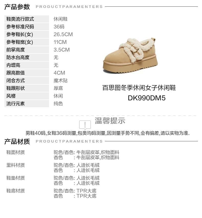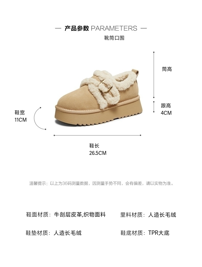 | 制鞋工艺:胶贴皮鞋 | 鞋垫材质:人造长毛绒 | 款式季节:冬季 | 前掌高度:3.5CM | 皮质特征:无 |