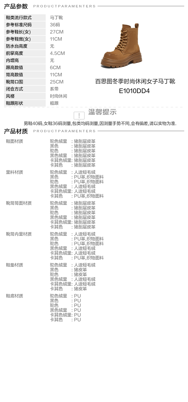 | 款式季节:冬季 | 鞋垫材质:猪皮革 | 渠道划分:线下同步 | 前掌高度:4.5CM | 皮质特征:无 |