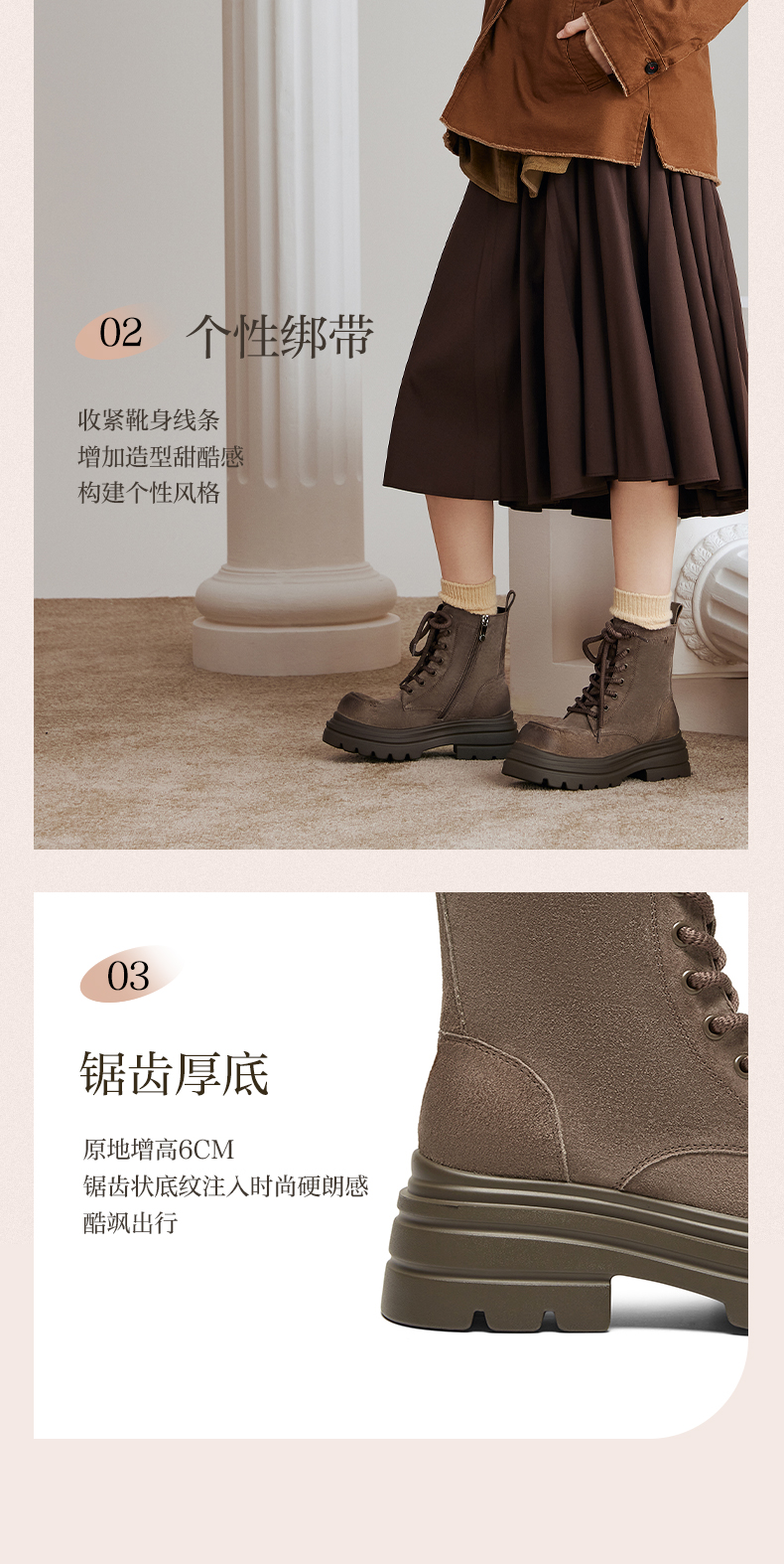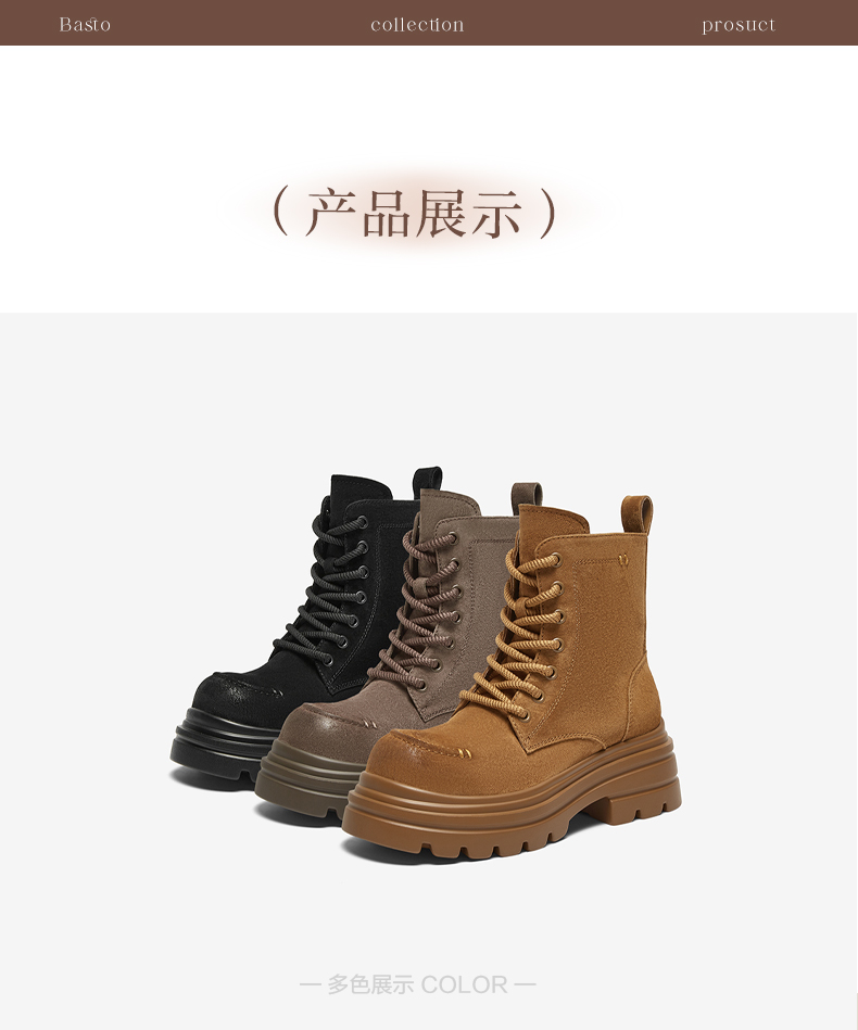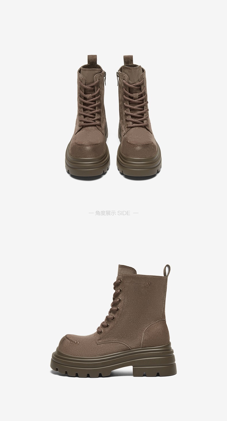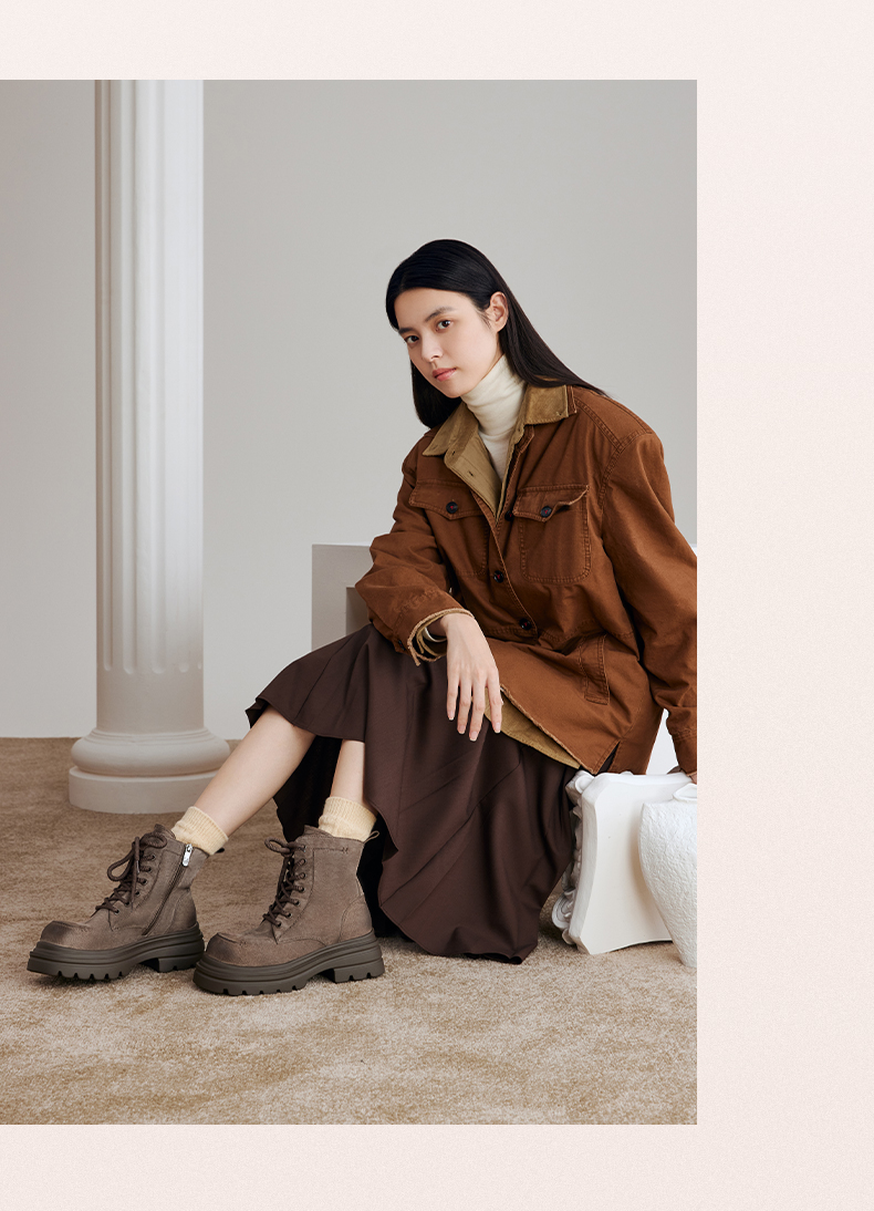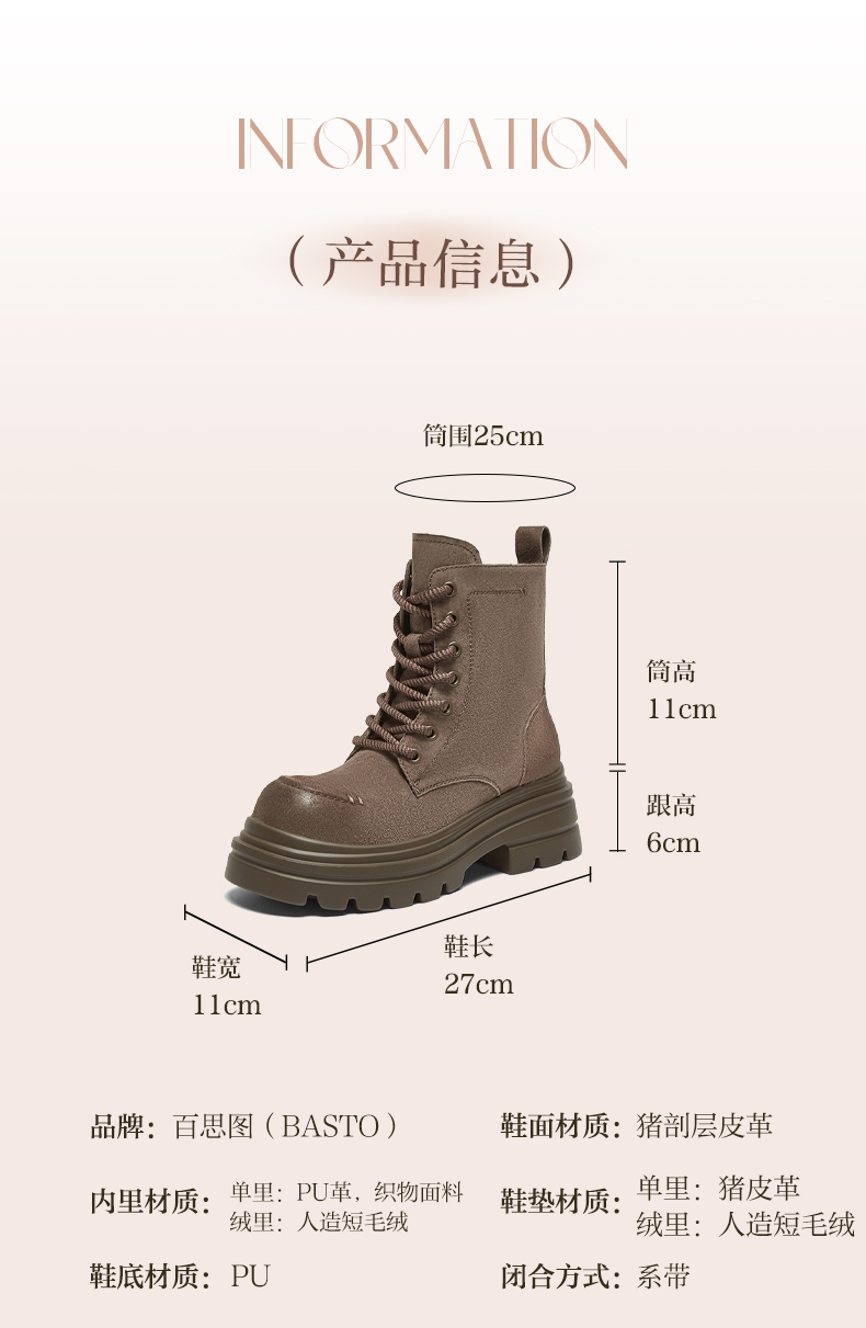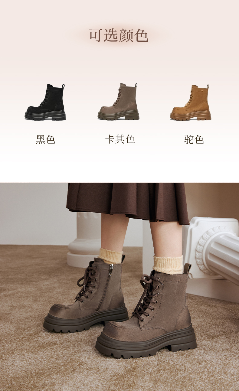 | 鞋类流行款式:马丁靴 | 鞋头款式:圆头 | 执行标准:舒适上班鞋Q/LR001-2023 | 跟高范围:高跟鞋(6-8CM) | 鞋面图案:纯色 |
