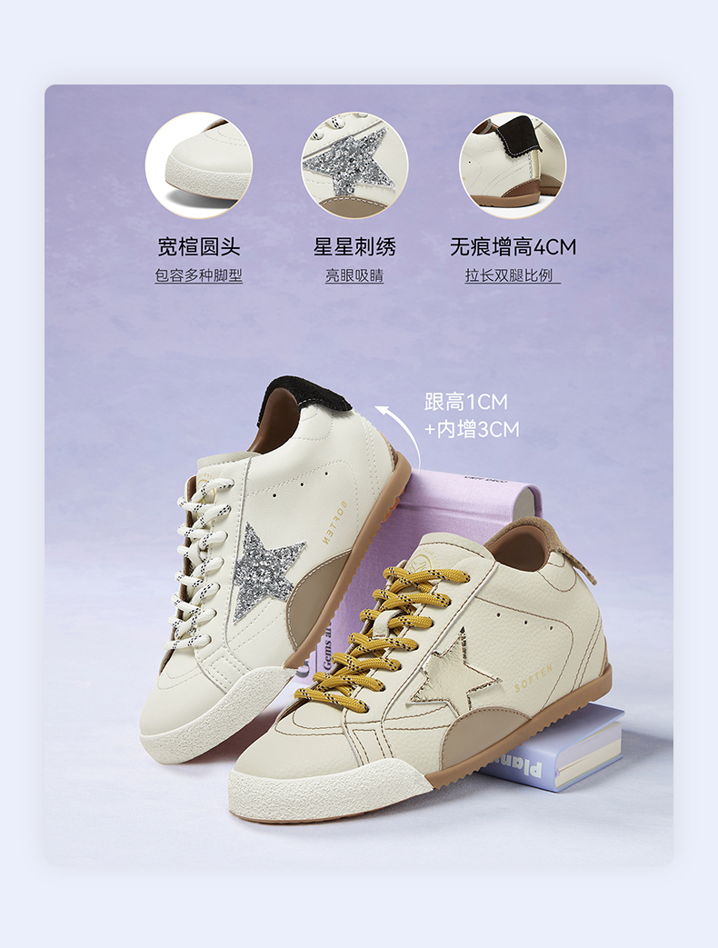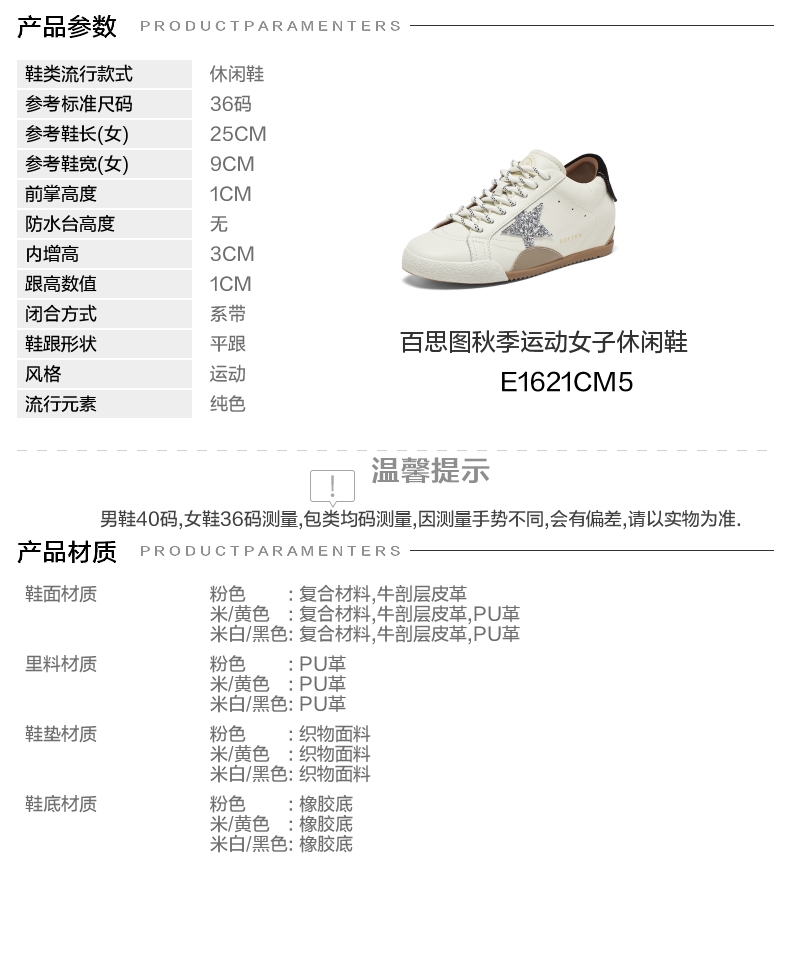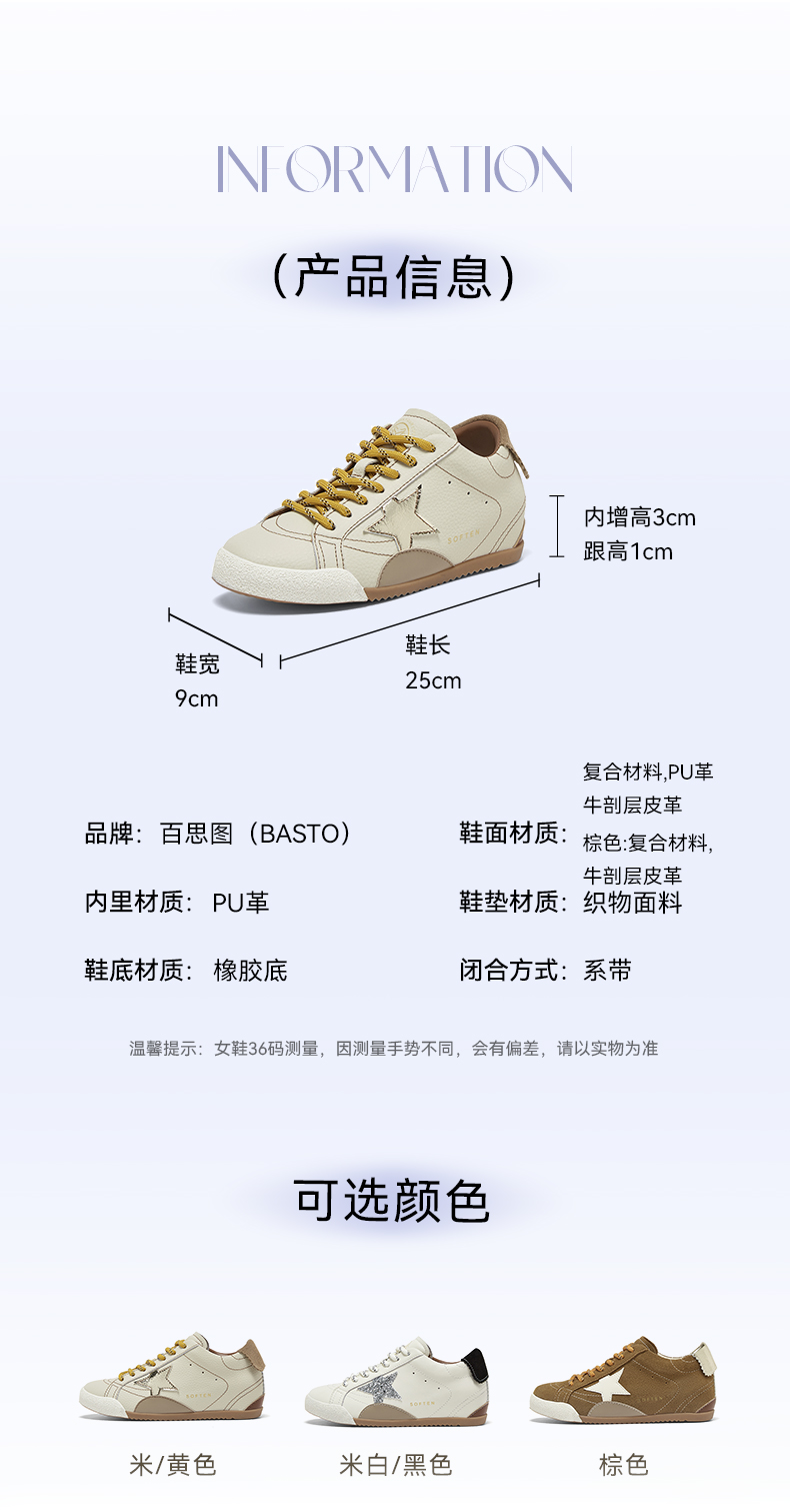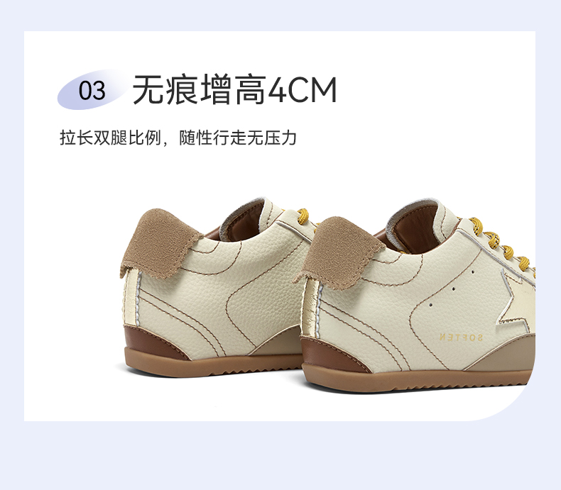 | 鞋帮:低帮 | 鞋底材质:橡胶底 | 内增高:3CM | 鞋面材质:牛剖层皮革复合材料PU革 | 闭合方式:系带 |