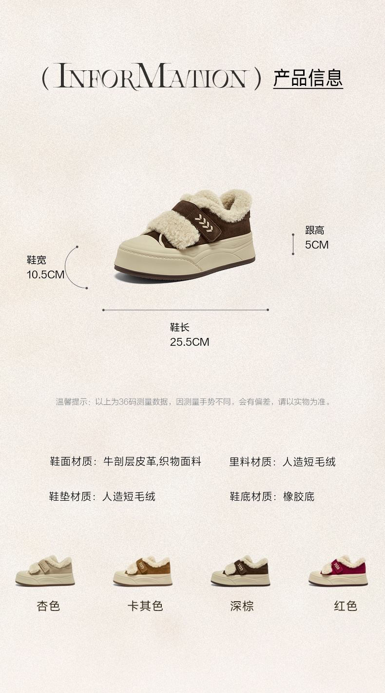 | 风格:运动 | 鞋面内里材质:人造短毛绒 | 色系:杏色 | 跟高数值:5CM | 性别:女子 |