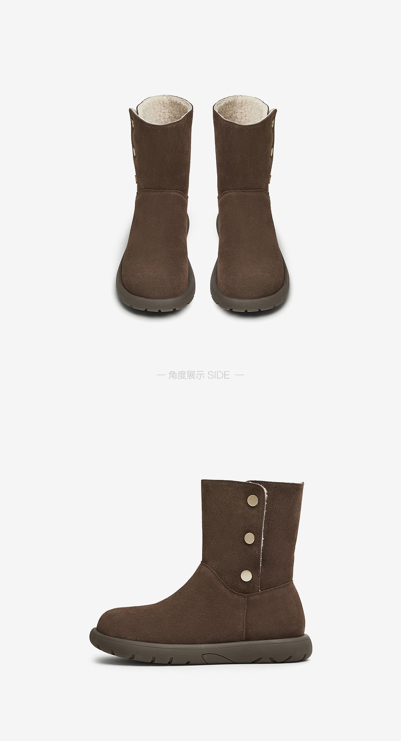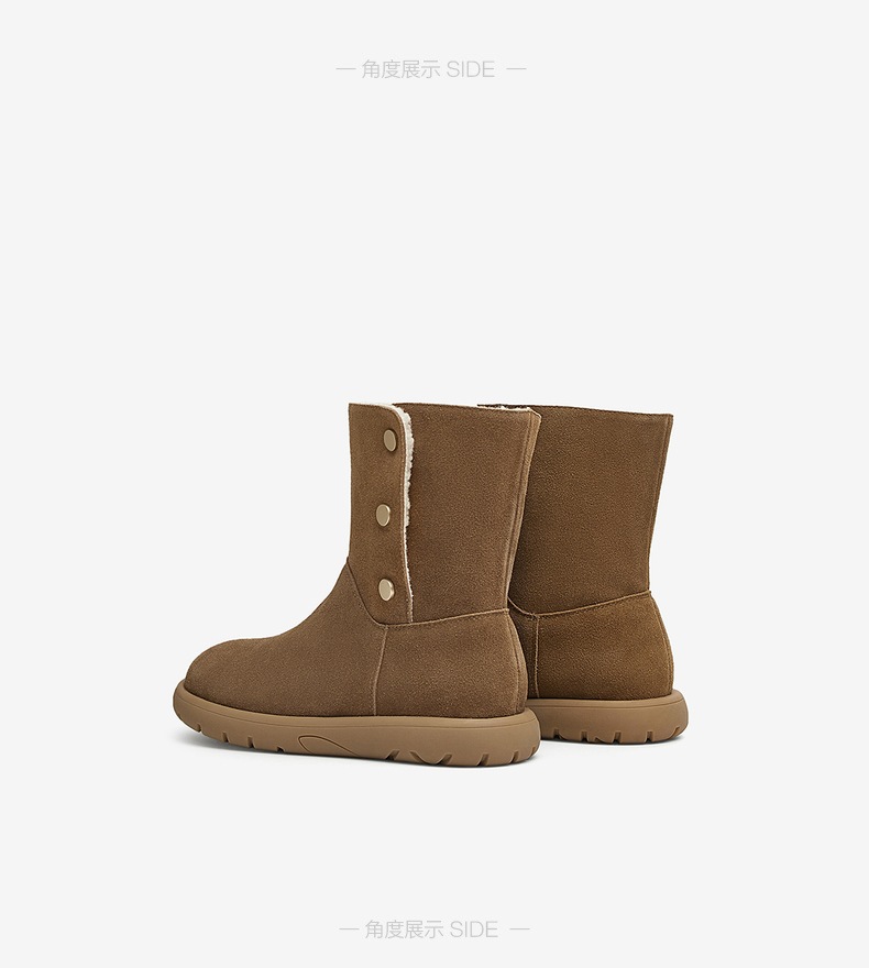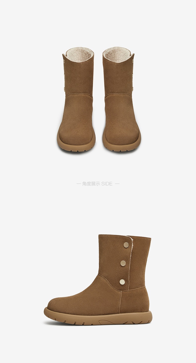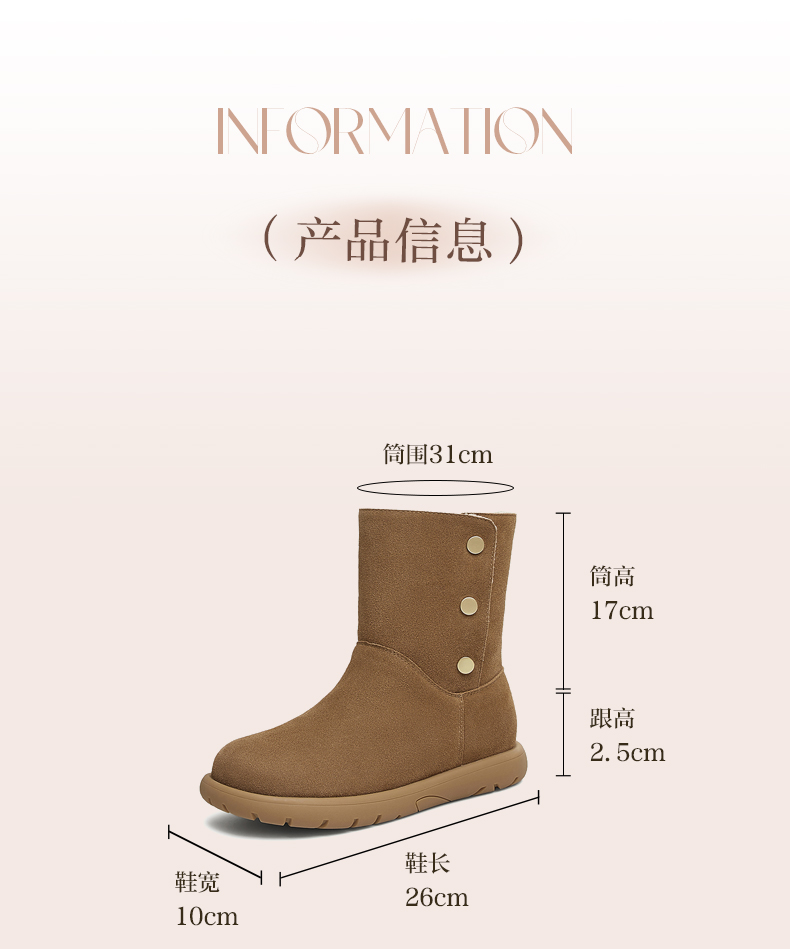 | 性别:女子 | 靴筒筒面材质:牛剖层皮革 | 里料材质:人造长毛绒 | 制鞋工艺:胶贴皮鞋 | 款式季节:冬季 |