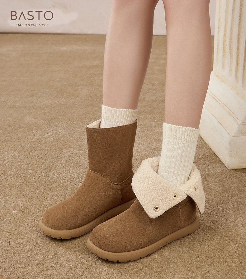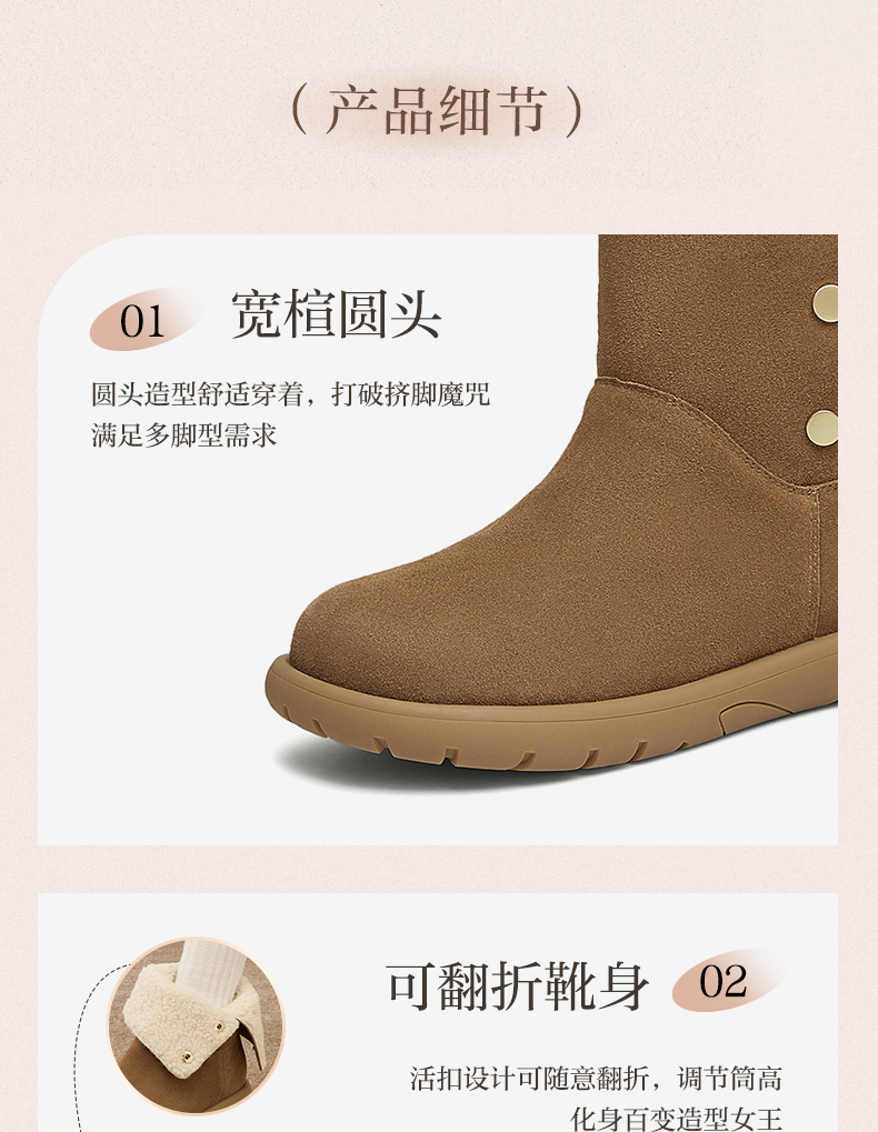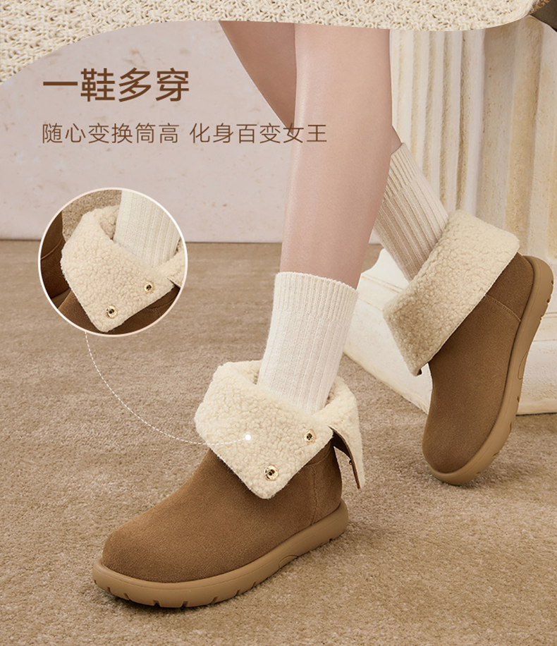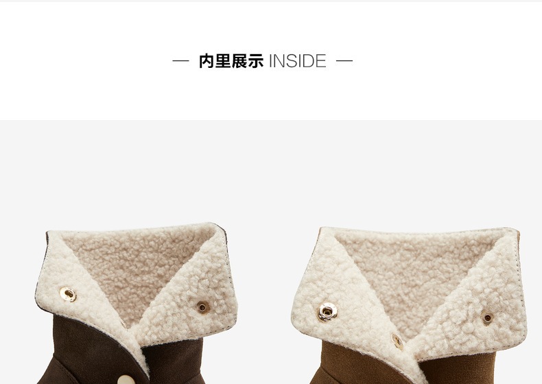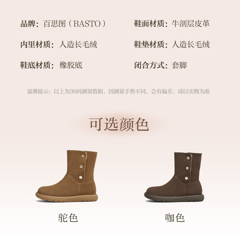 | 性别:女子 | 靴筒筒面材质:牛剖层皮革 | 里料材质:人造长毛绒 | 制鞋工艺:胶贴皮鞋 | 款式季节:冬季 |