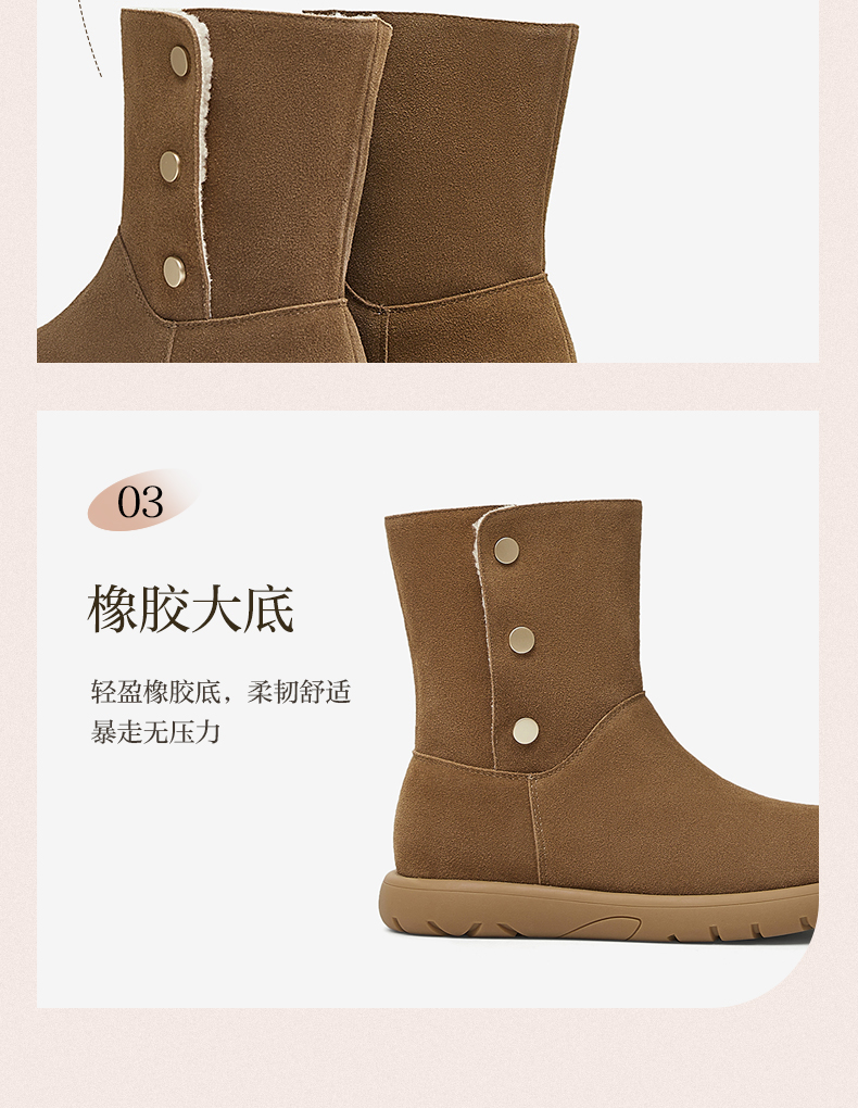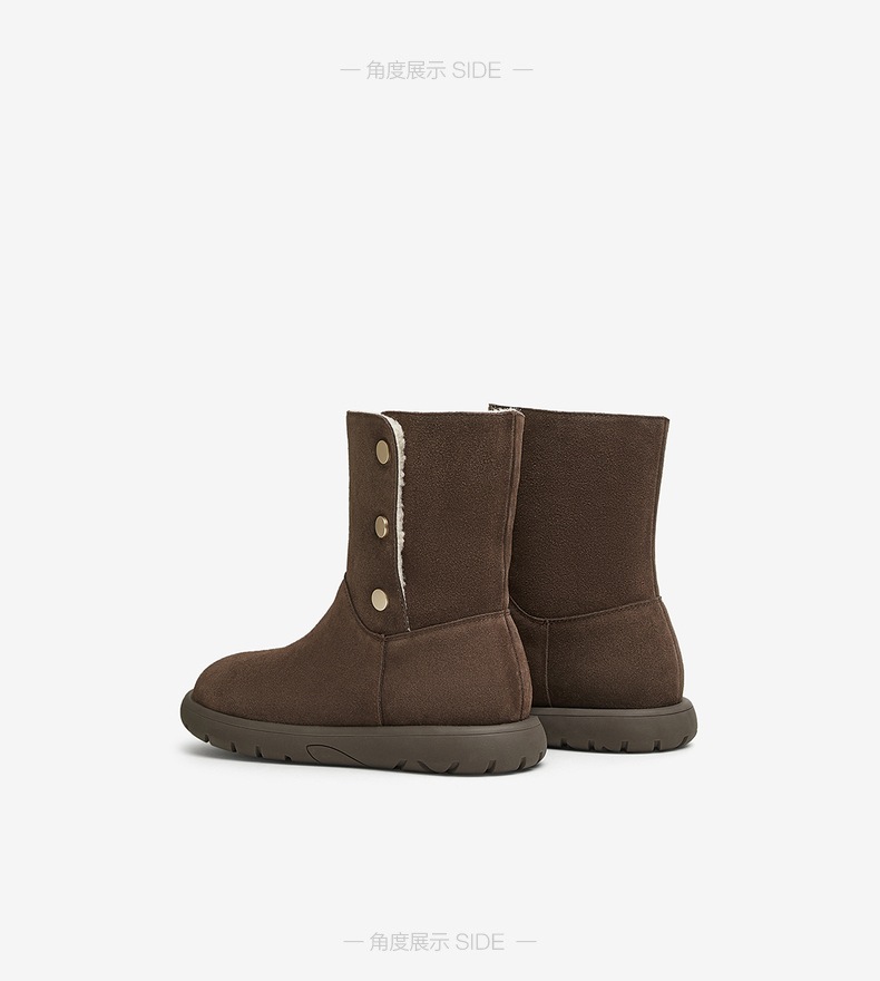 | 功能科技:防滑 | 鞋底材质:橡胶底 | 靴筒内里材质:人造长毛绒 | 内增高:无 | 鞋面材质:牛剖层皮革 |