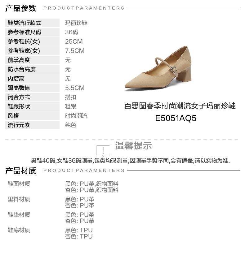 | 参考标准尺码:36码 | 跟高数值:5.5CM | 性别:女子 | 里料材质:PU革 | 制鞋工艺:胶贴皮鞋 |