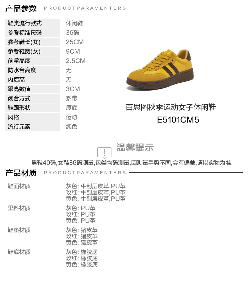 | 色系:黄色 | 跟高数值:3CM | 性别:女子 | 里料材质:PU革 | 制鞋工艺:胶贴皮鞋 |