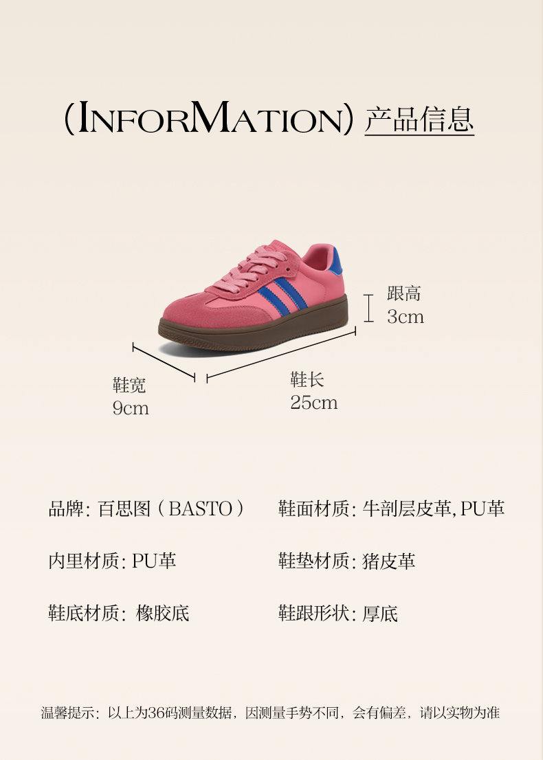 BASTO(百思图),品牌拥有17年历史,秉承优雅、甜美、清新的设计理念,主张“好嫁风”的产品风格,将甜美俏丽的少女情怀融合优雅气质的时尚品味,塑造出唯美优雅、受欢迎的女鞋款式。主打以女性温柔与亲和力为特色的流行时尚产品,糅合雅致又富有亲和力的裸粉色调,淑媛端庄、清新甜美。目前品牌已开设线下门店达1400多家。