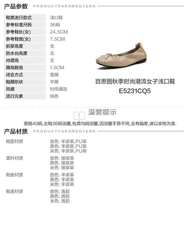 | 鞋面材质:PU革羊皮革 | 流行元素:纯色 | 参考鞋长(女):24.5CM | 参考鞋宽(女):7.5CM | 闭合方式:套脚 |