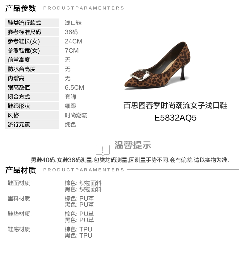 | 参考标准尺码:36码 | 跟高数值:6.5CM | 性别:女子 | 里料材质:PU革 | 制鞋工艺:胶贴皮鞋 |