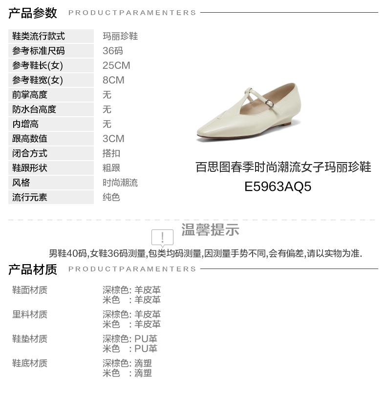 | 上市时间:2025年春季 | 生产/经销/进口厂家:丽荣鞋业(深圳)有限公司 | 鞋类流行款式:玛丽珍鞋 | 鞋头款式:尖头 | 执行标准:皮鞋QB/T1002-2015 |