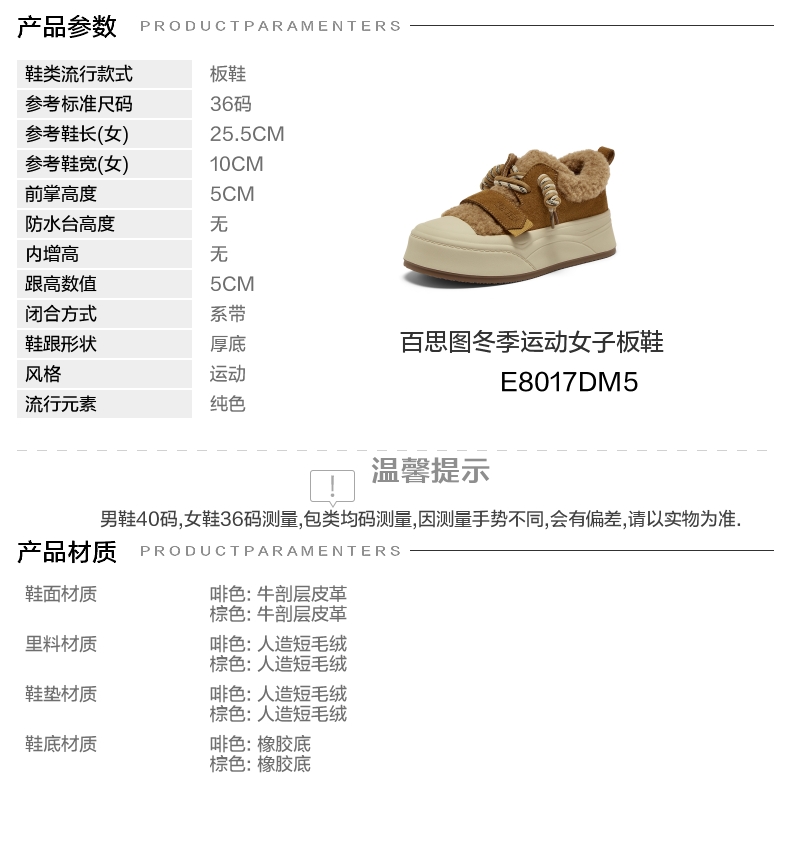 | 色系:棕色 | 跟高数值:5CM | 性别:女子 | 里料材质:人造短毛绒 | 制鞋工艺:胶贴皮鞋 |