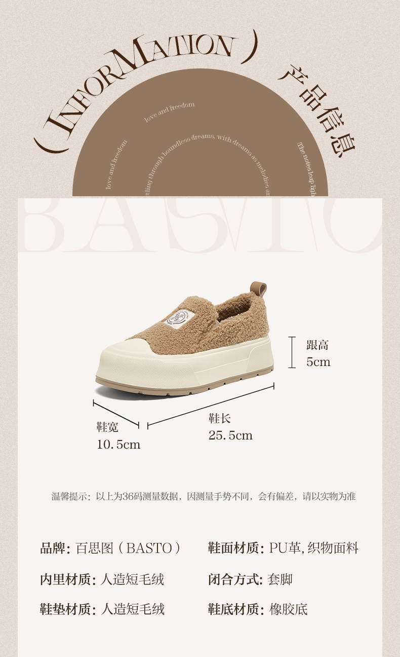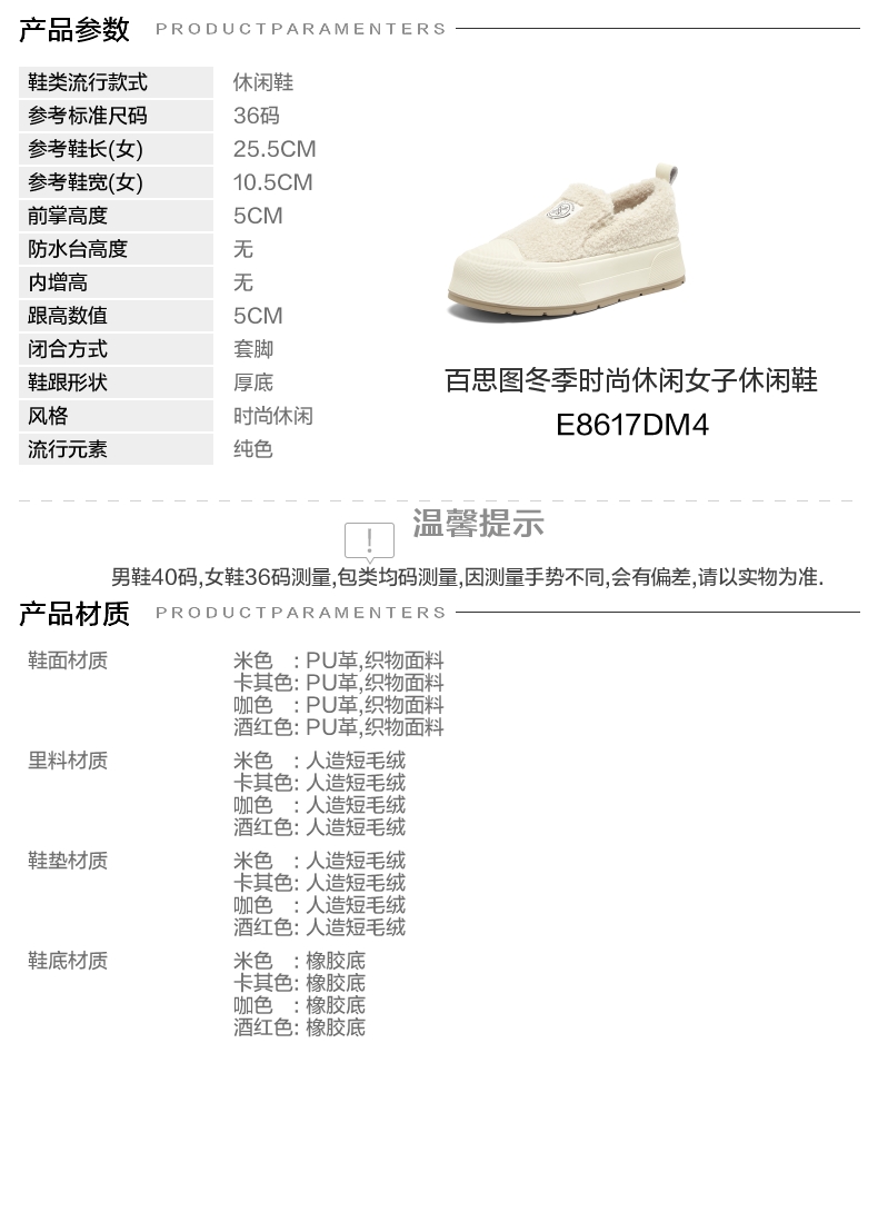 | 里料材质:人造短毛绒 | 制鞋工艺:胶贴皮鞋 | 鞋垫材质:人造短毛绒 | 款式季节:冬季 | 前掌高度:5CM |