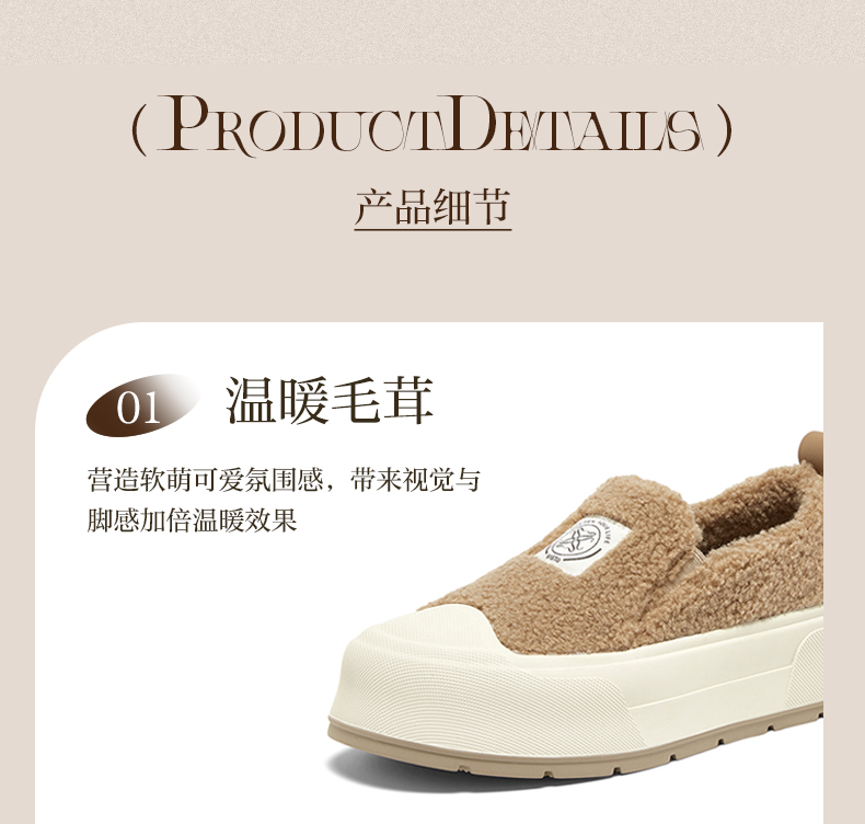 | 里料材质:人造短毛绒 | 制鞋工艺:胶贴皮鞋 | 鞋垫材质:人造短毛绒 | 款式季节:冬季 | 前掌高度:5CM |