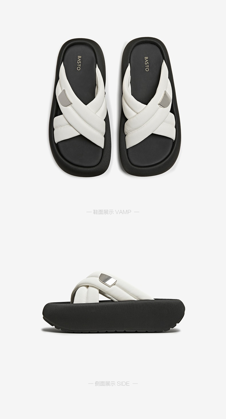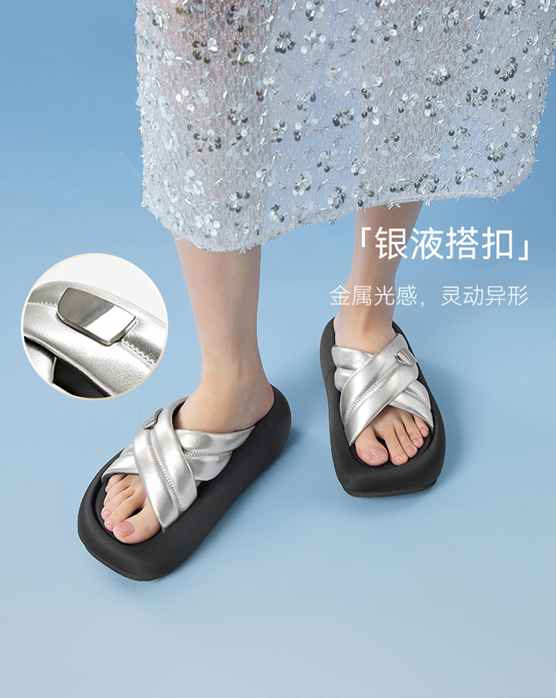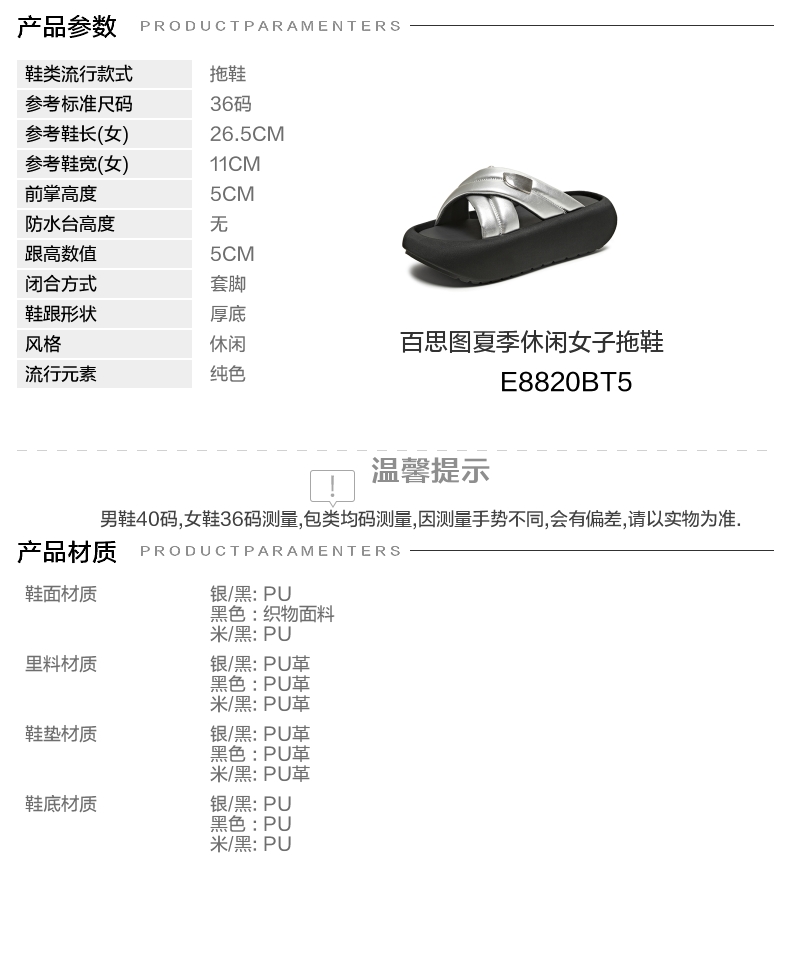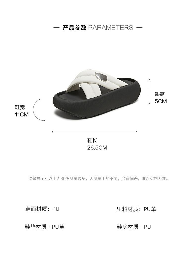 | 渠道划分:线下同步 | 前掌高度:5CM | 皮质特征:PU | 防水台高度:无 | 销售季:2025年夏季 |
