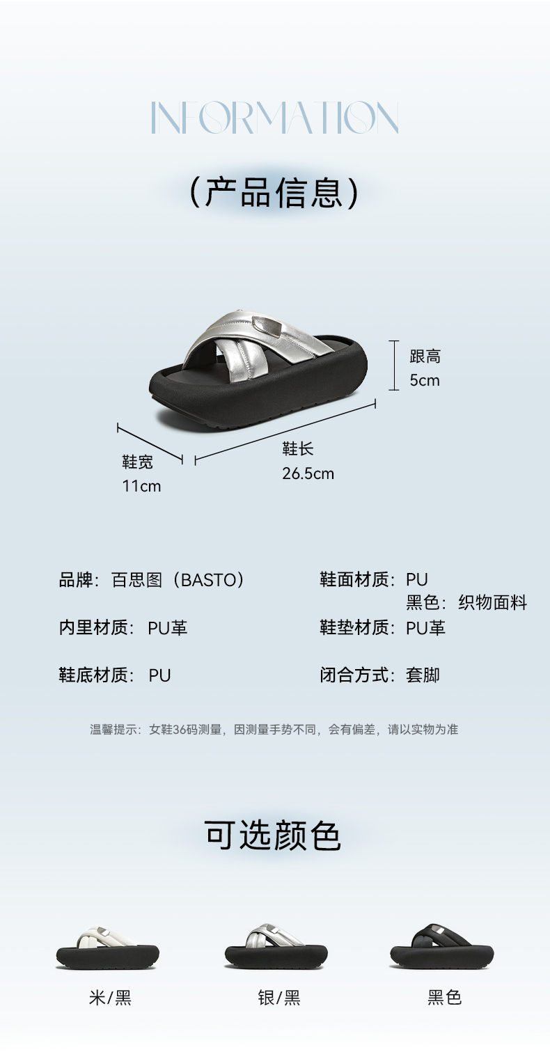 | 鞋类流行款式:拖鞋 | 鞋头款式:露趾 | 执行标准:舒适上班鞋Q/LR001-2023 | 跟高范围:中跟鞋(3-5CM) | 鞋面图案:纯色 |