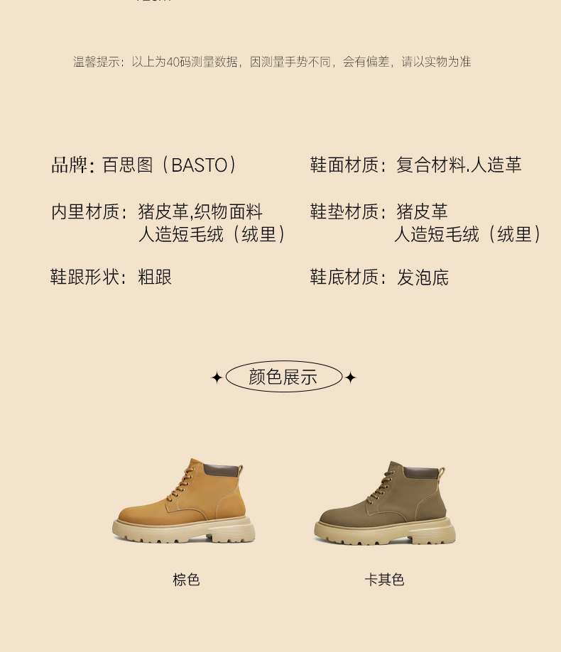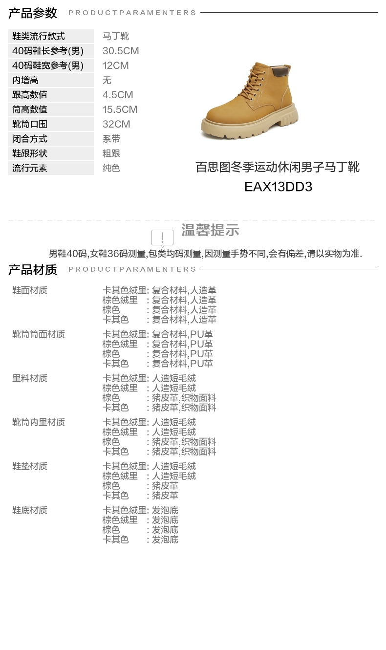 | 40码鞋长参考(男):30.5CM | 鞋底材质:发泡底 | 靴筒内里材质:织物面料猪皮革 | 内增高:无 | 鞋面材质:人造革复合材料 |