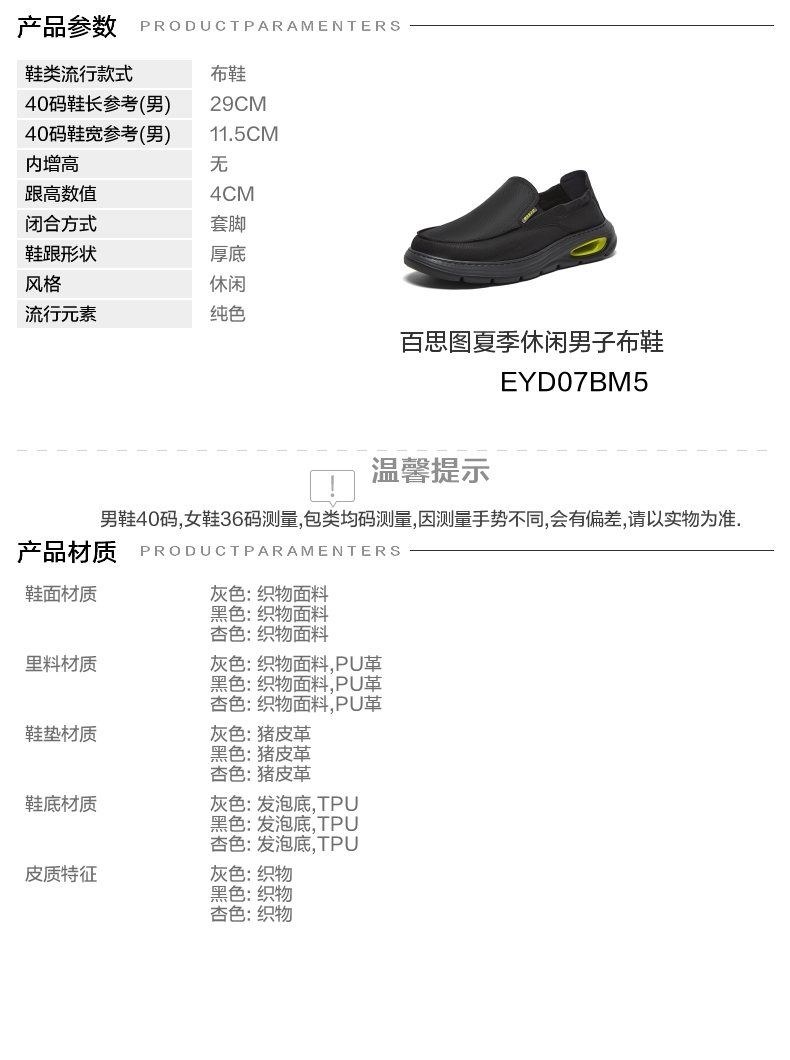 | 鞋面材质:织物面料 | 适用场合:日常休闲 | 闭合方式:套脚 | 所在区域:电子商务 | 40码鞋宽参考(男):11.5CM |
