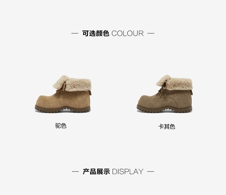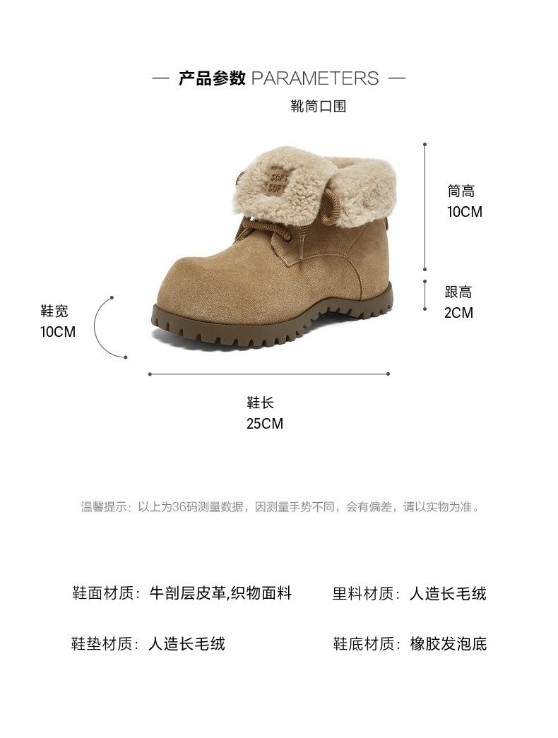 | 鞋底材质:橡胶发泡底 | 靴筒内里材质:人造长毛绒 | 内增高:3.5CM | 鞋面材质:织物面料牛剖层皮革 | 闭合方式:系带 |